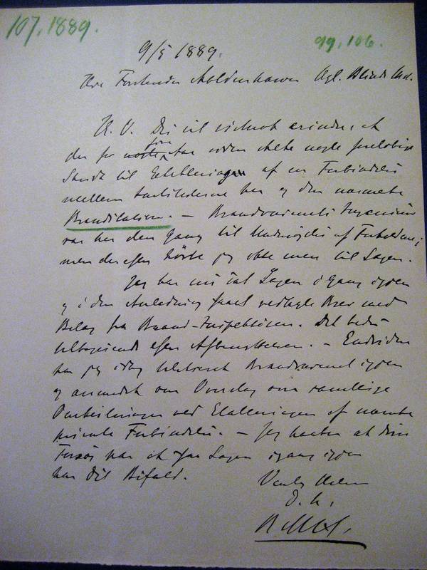 [5] JMC: Brevet er brandinspektør Meyers brev af den 8 maj 1889 samt bilag med specifikation angående omkostninger og vilkår for en direkte, privat telegrafisk ledning mellem de to institutter og den nærmeste brandstation.