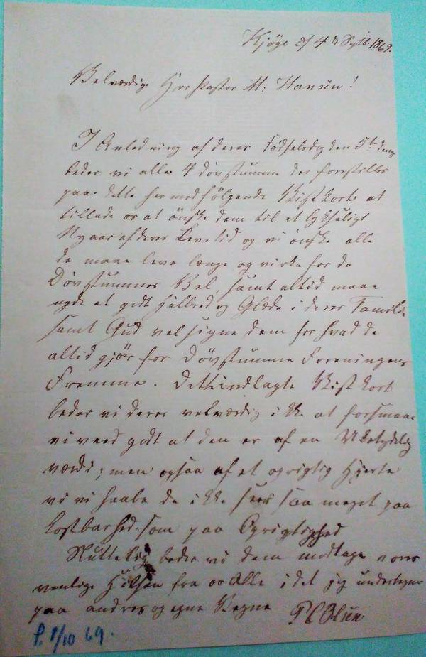 Dette brev er det hidtil tidligste brev, vi har fundet! Det findes i Rigsarkivets mappe ”Direktionens korrespondance”. Det burde nok ikke have havnet blandt de officielle handlinger – denne kærlige hilsen til Rasmus Malling-Hansen i anledning af hans 34 års fødselsdag er jo af helt personlig art, og jeg vil tro at den i sin tid er blevet fejlsorteret. Jeg beklager at ikke have været i stand til at tyde alle ord – skriften er meget svær at tyde, men hvis nogen kan hjælpe til med at udfylde hullerne, er jeg taknemmelig. Uanset disse mangler, er det tydeligt at disse tidligere elever er dybt taknemmelige overfor Malling-Hansen, og brevet er et rørende vidnesbyrd om deres varme følelser overfor ham.