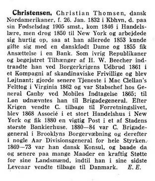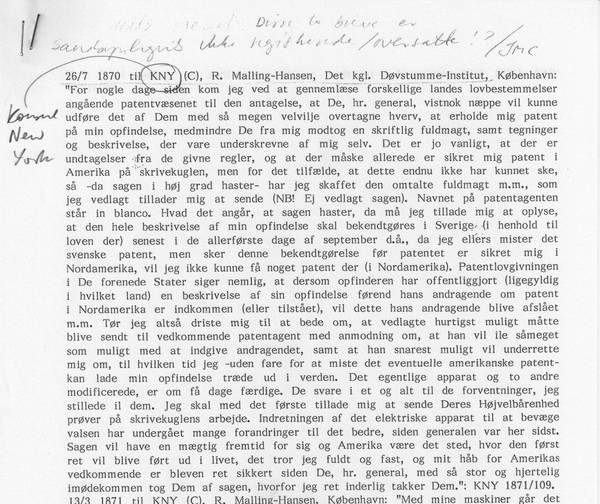 SA: Dette er et meget interessant brev, som vi først ganske sent i prosessen med å skrive inn alle Malling-Hansens kjente brev elektronisk, er blitt oppmerksom på. Vi kjenne pr dags dato kun til en transkribert versjon, som stammer fra arkivet til det danske konsulatet i New York. Vi har to brev fra dette arkivet, og de er der merket KNY 1871/109. Begge disse brevene var opprinnelig håndskrevne, og inneholder noen meget interessante opplysninger om de aller første skrivekuglene som ble bygget. De er skrevet til general Christensen i New York, og det har voldt oss en del besvær å finne ut hvem den angjeldende Christensen egentlig er, for RMH korresponderte også med en Christensen i København. Lenge trodde vi at det dreide seg om en og samme person, men nyere undersøkelser har vist at dette brevet er til danskamerikaneren Christian Thomsen Christensen, som bl a deltok i den amerikanske borgerkrigen og ble utnevnt til general. Han var i en periode på ca tre år, fra 1870 til 1873, konsul ved det danske konsulatet i New York, og drev også forretningsvirksomhet i perioder. Han var kjent for å være en god støttespiller for dansker i Amerika. Avskriveren har modernisert skrivemåten en del, bl. a. sløyfet stor forbokstav i substantiv og bruker å i stedet for aa, og vi gjengir her brevet i den moderniserte form.