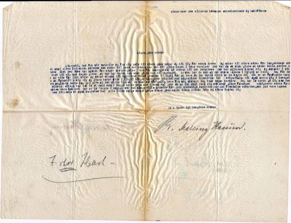 [2] CB: Vigtigt: Når man læser denne tekst er det mærkeligt, at linierne slutter midt i et ord og det næste bogstav i ordet så kommer i næste linie. Se fotografiet af brevet på web-sitet. MEN: Det skyldes skrivekuglens indretning i første version, hvor papiret var rullet omkring en valse, der var skjult under trælåget. Man skrev derfor i én lang stribe, uden at tænke på linieskift, som vi nutildags jo laver hele tiden. Man skrev simpelthen sit brev i en lang tekststreng, der snoede sig rundt om valsen - og derfor slutter og starter linierne helt tilfædigt, som det ses i dette brev. Det har jeg sgu aldrig opdaget før nu - 1 august 2007!