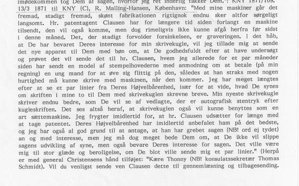 SA: Her følger ytterligere et av RMH-brevene fra arkivet til det danske konsulatet i New York. Vi kjenner foreløpig kun til en transkribert versjon, og kan således ikke fastslå med 100% sikkerhet om originalen var håndskrevet, eller skrevet på skrivekugle, men da et av ordene ikke har latt seg tyde, er det ganske sikkert at originalen var håndskrevet, og RMHs håndskrift var ikke alltid like enkel å tyde. Brevet er til den danske konsulen i New York, general Christian Thomsen Christensen, som var innehadde dette embedet fra 1870 til 1873. RMH strever fortsatt med å få et amerikansk patent, og som vi vet, oppnådde ikke skrivekuglen den suksess i USA som RMH gadde håpet - desverre. Og han klager over at produskjonen av nye maskiner i Danmark går svært langsomt, og særlig er det graveringen av stemplene som tar lang tid. I konsulatets arkiv, er brevet katalogisert under koden KNY 1871/109. Avskriveren har modernisert skrivemåten en del, bl. a. sløyfet stor forbokstav i substantiv og bruker å i stedet for aa, og vi gjengir her brevet i den moderniserte form.