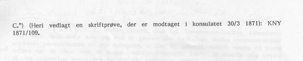(Heri vedlagt en skriftprøve, der er modtaget i konsulatet 30/3 1871)