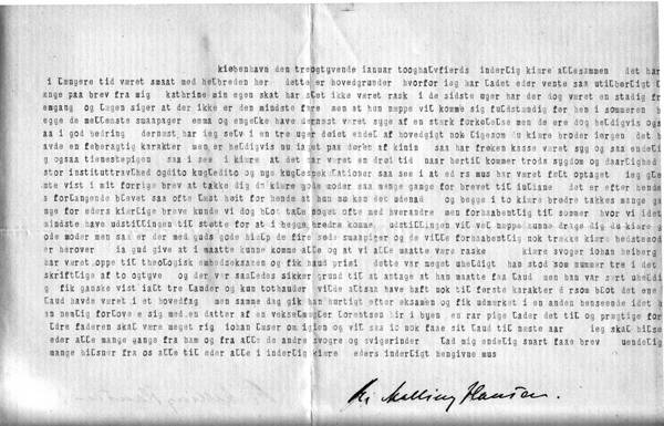 copenhagen the twentythird of january seventytwo dearest all we have had health problems here for quite some time this is the main reason why i have made you wait for such an unseemly long time for a letter from me my darling kathrine has not been well at all however during the last few weeks there has been steady progress and the doctor says that there is not the slightest danger but that she is not likely to recover completely until sometime next summer then our two daughters emma and engelke also went down with a severe cold but luckily they are also recovering well i myself have for three weeks been bothered with headaches i suppose similar to yours dear brother iørgen it had a feverish character but fortunately it has now been chasen away by quinine in addition miss kasse has been ill and to complete the picture now also the maid so as you can see dear we have gone through a hard time and when we add to illness and weakness also the great pressure of work at the institution as well as with the writing ball and new ideas in this area you will appreciate that your mouse[1] has been terribly busy i think i forgot in my previous letter to thank you dear brother for your letter to juliane it has on her request been read to her so many times that by now she knows it by heart and heartfelt thanks to both of you dear brothers for your lovely letters i do wish we could talk to each other more often but hopefully at least next summer when we have the exhibition[2] to entice the two of you to come i don’t suppose the exhibition will attract you dear mother but then again we have by the grace of god the four sweet little girls and hopefully they will be able to entice dear grandmother to travel here yes i pray to god that you may all be able to come here and that all of us may enjoy good health dear brother in law iohan heiberg has sat for his theological final university exam and was given the mark of haud primi[3] this was very unfortunate he was graded as number three out of twentytwo students in the written part and hence there were firm reasons to assume that he would be given a laude but he was oddly unlucky he did get three laudes and only two haudes consequently this would have been enough to get the highest mark if only one of the laude had been in a major however on that same day quickly after his exam he did achieve excellently in another respect because he was betrothed to a daughter of a local bill broker by the name of lorentsen a nice girl it seems and splendid parents they say the father is a very rich man iohan will repeat his studies and i think he will get his laude next year i have fondest greetings from him and from all the other brothers and sisters in law i am hoping you will write soon warmest greetings from all of us to all of you dear people your deeply devoted mouse
