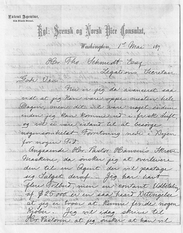 By now I have recovered enough to stay out of bed almost the entire day, but it will be a while still before I can get out into the fresh air, and for some time to come I will not be able to attend to any business downtown. Concerning Reverend Hansen’s typewriter I wish to hand it over to an agent for him to be responsible for the marketing. – I have had several offers, but a cash payment of 25.000$[2] is such a hard term that I doubt that I will find any buyer. I intend to write to the Reverend today, requesting him to supply me with the name of an agent to whom I can surrender, after June 1, the patent, the machine and the documents in my possession. - In regard to the tickets for the steamship “Humboldt” I kindly ask you to inform me whether you are in a position to obtain the 25% reduction on each one or on only one return ticket. When is “Humboldt” due to leave New York? I have by now no doubt that I shall recover sufficiently and be able to travel – when can we reserve our state room and when can we buy the tickets? Could you kindly purchase the tickets and reserve us a good state room? Yesterday Lauritzen mentioned that he wished to pay $ 100 for the journey, and if he travels back to New York on a ship from the same company that he would then be able to get the return trip for $ 70.00 -Lauritzen will possibly stay in Denmark for quite a long period and hence doesn’t wish to bind himself to any predetermined time. – If you see anything in New York that you think would be suitable to use in Denmark[3], kindly take note and let me know about it when I get to New York. – Thank you very much for the daily newspapers – during my illness at times I was depressed – I was not allowed to speak and couldn’t be bothered to read – however, when the newspapers arrived I was able to read eagerly.