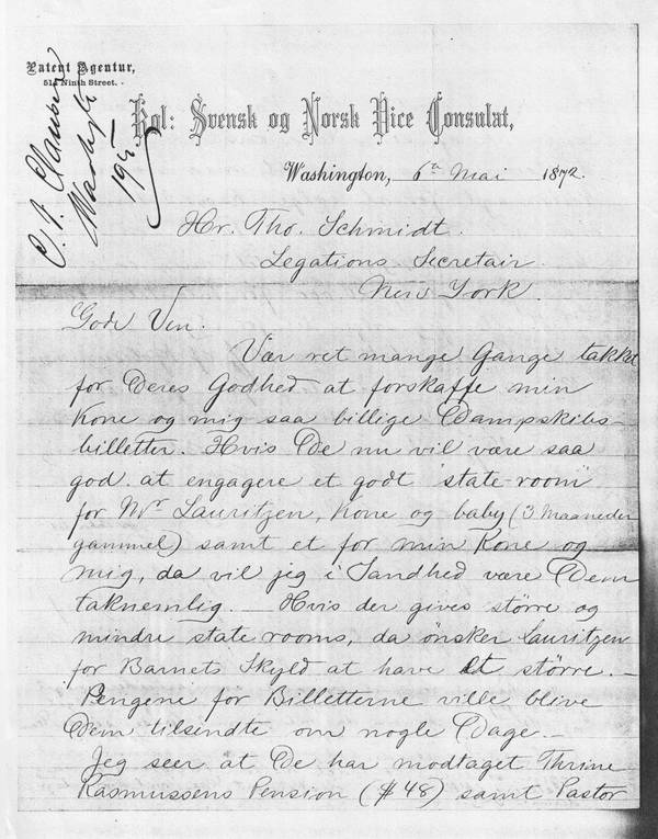 Thank you ever so much for your kindness to arrange such inexpensive steamship tickets for my wife and myself. If you would now be so good as to reserve a good state room for Mr Lauritzen, his wife and baby (3 months old) and another one for my wife and me, I will be truly grateful. If they have larger and smaller state rooms, Lauritzen wishes for the child’s sake the larger one. The money for the tickets will be transferred to you within a few days.I note that you have received Thrine Rasmussen’s pension ($ 48) as well as Reverend Hansen’s patent – you can have as many copies of it that you may wish. The Reverend hasn’t sent me any power of attorney to sell his patent, but via Editor Watt[2], who was here last winter (1872), he has informed me that he demanded $ 20.000 for the patent – in case Watt or I could sell it at such a price, the Reverend would pay us 10% of the purchase price. In case, however, we could get $ 25.000 or above our commission would be 15%. Later on the Reverend wrote to me that he was not willing to sell the patent below $25.000 cash.The best offer I have had was $ 10.000 for the patent, of which $5.000 in cash and an instalment of $ 20 per machine sold until the balance ($ 5.000) had been paid. - I have a complete machine here that works very well - - and in case you intend to take over the sale of the typewriter, I will be happy to send you the machine, and when I get to New York I can provide you with all the information you may wish. There is no written contract between the Reverend and myself – I wish you will take over this task. – Yours faithfully, C.F. Clausen