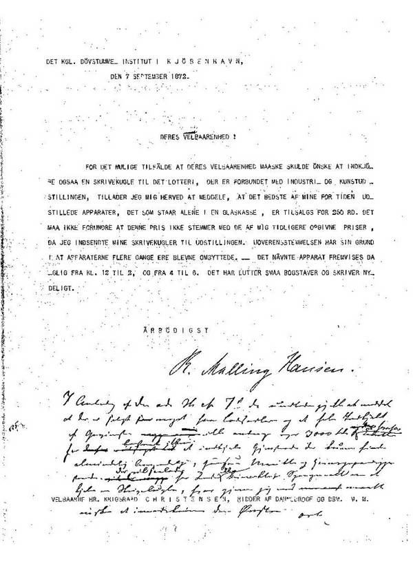IN CASE YOUR GRACE MIGHT WISH TO PURCHASE A WRITING BALL ALSO FOR THE LOTTERY CONNECTED TO THE ART AND INDUSTRIAL EXHIBITION, I HEREBY TAKE THE LIBERTY TO INFORM YOU THAT THE BEST SPECIMEN OF THE MACHINES I AM CURRENTLY EXHIBITING, THE ONE THAT IS PLACED BY ITSELF IN A GLASS CASE, IS FOR SALE AT THE PRICE OF 250 RIX-DOLLAR. IT SHOULD BE NO SURPRISE THAT THIS PRICE DOES NOT TALLY WITH THE PRICES I PREVIOUSLY QUOTED, WHEN SENDING MY WRITING BALLS TO THE EXHIBITION. THE DISCREPANCY IS BECAUSE OF THE FACT THAT THE MACHINES HAVE BEEN SWITCHED SEVERAL TIMES. ______THE SAID SPECIMEN IS ON SHOW DAILY FROM 12 O´CLOCK TO 2 AND FROM 4 TO 6. IT USES ONLY LOWER CASE LETTERS AND WRITES BEAUTIFULLY.