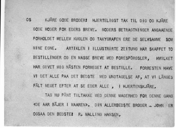 I AM AFRAID YOU WILL HAVE TO BE CONTENT WITH THESE FEW LINES FOR NOW “THINGS’LL GET BET’R MORROW”[3] . YOUR VERY BEST BROTHER – JOHN IS ALSO THE BEST. R.MALLING HANSEN