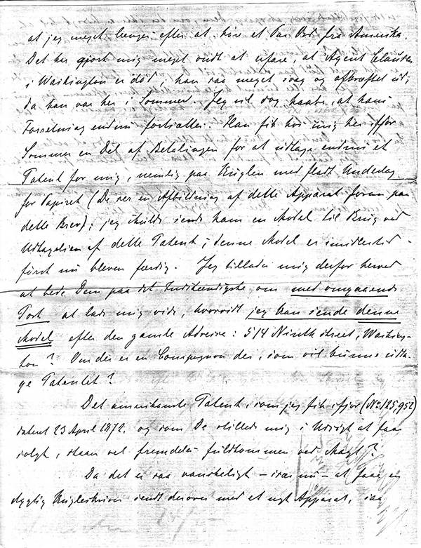 Han fik hos mig her ifjor Sommer en Del af Betalingen for at udtage endnu et Patent for mig, nemlig paa Kuglen med fladt Underlag for Papiret (Der ses en Afbildning af dette Apparat foran paa dette Brev[3]); jeg skulle sende ham en Model til Brug ved Udtagelsen af dette Patent; denne Model er imidlertid først nu bleven færdig. Jeg tillader mig derfor herved at bede Dem paa det Indstændigste om med omgaaende Post at lade mig vide, hvorvidt jeg kan sende denne Model efter den gamle Adresse: 514 Ninth Street, Washington? Om der er en Compagnon der, som vil kunne udtage Patentet?
