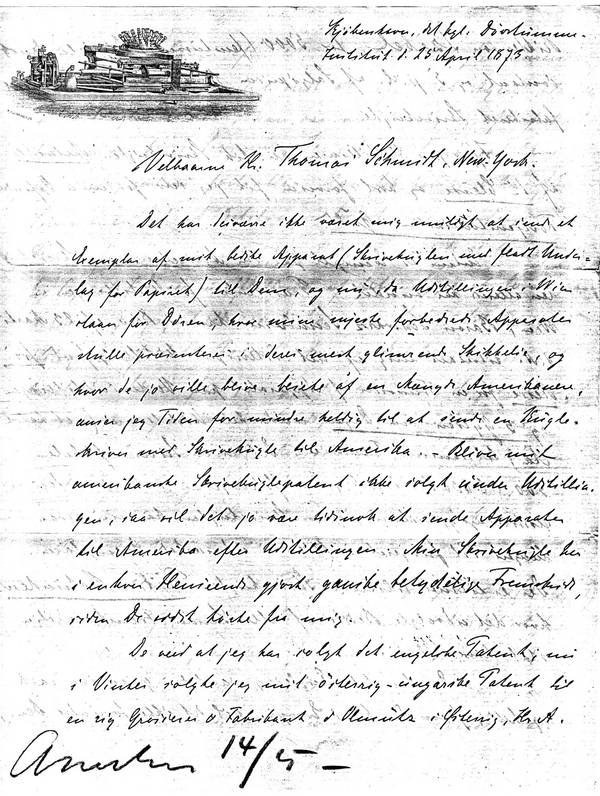 Det har desværre ikke været mig muligt at sende et Exemplar af mit bedste Apparat (Skrivekuglen med fladt Underlag for Papiret) til Dem, og nu, da Udstillingen i Wien står for Døren; hvor mine nyeste forbedrede Apparater skulle præsenteres i deres mest glimrende Skikkelse, og hvor de jo ville blive besete af en Mængde Amerikanere, anser jeg Tiden for mindre heldig til at sende en Kugleskriver [2] med Skrivekugle til Amerika.