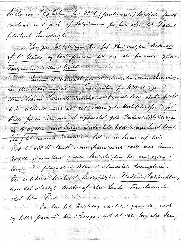 Endnu et Eksempel på den Anseelse, som Skrivekuglen allerede har vundet: Præsidenten for Udstillingen i Wien, Baron Schwarz Sennborn har ved brev af 23 Marts d.A. tilstaaet mig af det österrigske Udstillingsfond fri Reise for en Fremviser af Apparatet paa Verdensudstillingen og 3 Gylden om Dagen under hele Udstillingen ( i et halvt Aar) til samme Fremviser. Det er en Sum af hele 500 til 600 Kr. dansk, som Østerrigerne sætte på denne Udstillingsgjenstand; men Skrivekuglen har nu ogsaa i længere Tid fungeret i Wien i udmærkede Exemplarer.