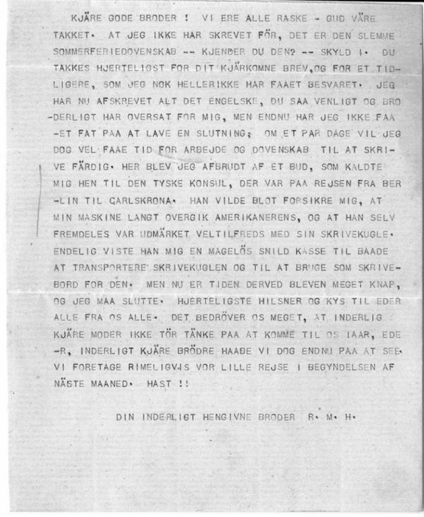 THANK YOU SO MUCH FOR YOUR DEAR LETTER AS WELL AS FOR A PREVIOUS ONE, WHICH I THINK I ALSO HAVE NOT REPLIED TO. I HAVE BY NOW COPIED ALL THE ENGLISH TEXT THAT YOU WERE SO VERY KIND TO TRANSLATE FOR ME, BUT I HAVN’T COME AROUND YET TO DRAFTING THE FINISHING PART; HOWEVER, IN A FEW DAYS TIME I GUESS MY OTHER WORK, AND MY LAZINESS, WILL ALLOW ME TO FINISH THE TASK. RIGHT NOW I WAS INTERRUPTED BY A MESSENGER WHO REQUESTED ME TO CALL ON THE GERMAN CONSUL, WHO WAS TRAVELLING BETWEEN BERLIN AND CARLSKRONA. HE MERELY WANTED TO ASSURE ME THAT MY MACHINE IS FAR SUPERIOR TO THE ONE MADE BY THE AMERICAN[1], AND THAT HE HIMSELF CONTINUED TO BE VERY SATISFIED WITH WITH HIS WRITING BALL. IN ADDITION, HE SHOWED ME A REMARKABLY INGENUOUS CASE USED BOTH FOR TRANSPORTING THE WRITING BALL AND FOR USING IT AS A DESK FOR THE MACHINE. BUT NOW TIME IS GETTING VERY SHORT AND I HAVE TO END HERE. WARMEST GREETINGS AND KISSES TO ALL OF YOU FROM ALL OF US. I AM VERY SAD THAT DEAR MOTHER DARES NOT THINK ABOUT VISITING US THIS YEAR, BUT YOU MY DEAR BELOVED BROTHERS I DO HOPE WE WILL SEE WE ARE LIKELY TO MAKE OUR SHORT JOURNEY AT THE BEGINNING OF NEXT MONTH. VERY HASTILY,