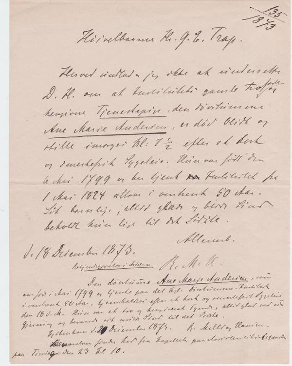 Sir, It is my duty to inform you that the old and faithful maid servant of our institute, the deaf-mute Ane Marie Andersen, passed away gently and quietly this morning at half past seven after a short and painless illness. She was born May 6, 1799, and has served the institute from May 1, 1824, in other words for close to 50 years. She kept her childlike, always merry and gentle disposition until the very end.