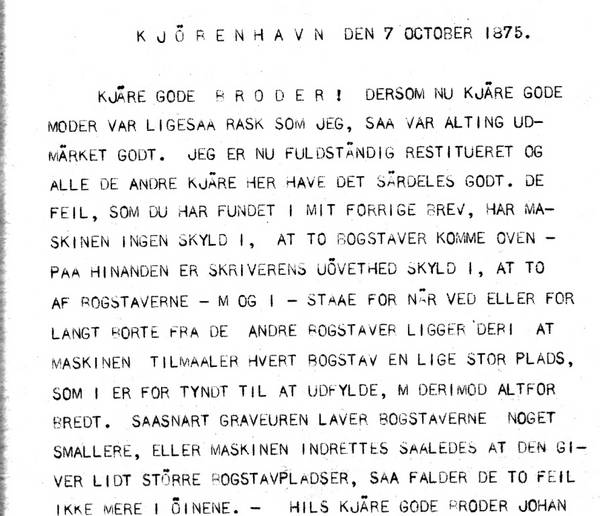 KJÄRE GODE B R O D E R ! DERSOM NU KJÄRE GODE MODER VAR LIGESAA RASK SOM JEG, SAA VAR ALTING UDMÄRKET GODT. JEG ER NU FULDSTÄNDIG RESTITUERET OG ALLE DE ANDRE KJÄRE HER HAVE DET SÄRDELES GODT. DE FEIL, SOM DU HAR FUNDET I MIT FORRIGE BREV, HAR MASKINEN INGEN SKYLD I, AT TO BOGSTAVER KOMME OVENPAA HINANDEN ER SKRIVERENS UÖVETHED SKYLD I, AT TO AF BOGSTAVERNE - M OG I - STAAE FOR NÄR ELLER FOR LANGT BORTE FRA DE ANDRE BOGSTAVER LIGGER DERI, ATMASKINEN TILMAALER HVERT BOGSTAV EN LIGE STOR PLADS, SOM I ER FOR TYNDT TIL AT UDFYLDE, M DERIMOD ALTFOR BREDT. SAASNART GRAVEUREN LAVER BOGSTAVERNE NOGET SMALLERE, ELLER MASKINEN INDRETTES SAALEDES, AT DEN GIVER LIDT STÖRRE BOGSTAVPLADSER, SAA FALDER DE TO FEIL IKKE MERE I ÖINENE . - HILS KJÄRE GODE BRODER JOHAN