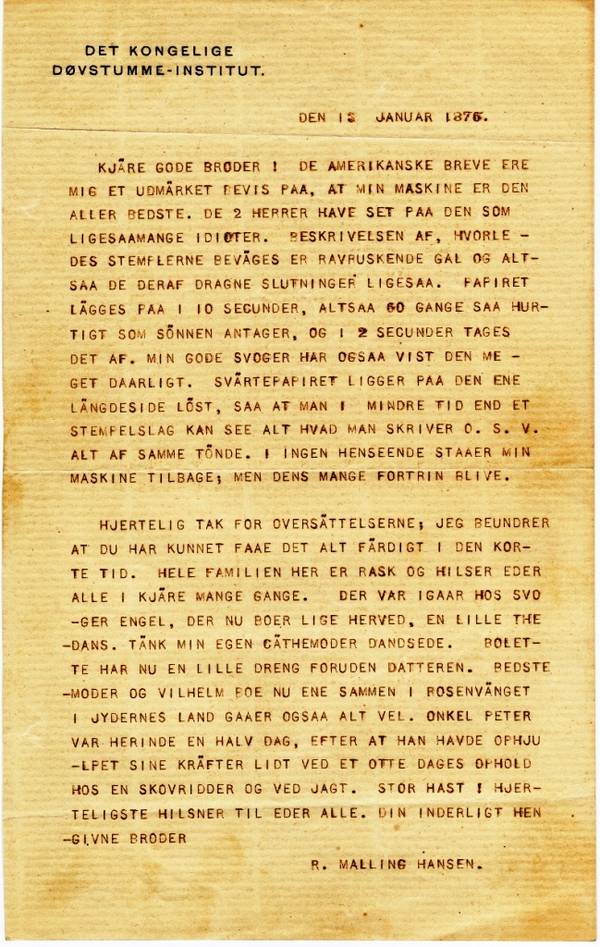 KJÄRE GODE BRODER ! DE AMERIKANSKE BREVE ERE MIG ET UDMÄRKET BEVIS PAA, AT MIN MASKINE ER DEN ALLER BEDSTE. DE 2 HERRER [1]HAVE SET PAA DEN SOM LIGESAAMANGE IDIOTER. BESKRIVELSEN AF, HVORLEDES STEMPLERNE BEVÄGES ER RAVRUSKENDE GAL OG ALTSAA DE DERAF DRAGNE SLUTNINGER LIGESAA. PAPIRET LÄGGES PAA I 10 SECUNDER, ALTSAA 60 GANGE SAA HURTIGT SOM SÖNNEN ANTAGER, OG I 2 SECUNDER TAGES DET AF. MIN GODE SVOGER HAR OGSAA VIST DEN MEGET DAARLIGT[2]. SVÄRTEPAPIRET LIGGER PÅ DEN ENE LÄNGDESIDE LÖST, SAA AT MAN I MINDRE TID END ET STEMPELSLAG KAN SE ALT HVAD MAN SKRIVER O. S. V. ALT AF SAMME TÖND[3]E. I INGEN HENSEENDE STAAER MIN MASKINE TILBAGE; MEN DENS MANGE FORTRIN BLIVE.