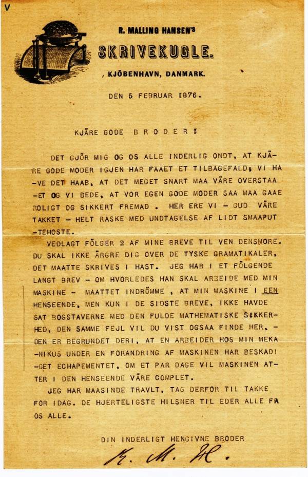 [2] Hvad der står i disse breve til Densmore (og fra) er desværre ukendt, men ekstremt vigtigt. Densmore var advokat for Sholes, der producerede den første amerikanske skrivemaskine i 1873 - på Remington-fabrikken. Den maskine der - helt ufortjent - slog benene væk under skrivekuglen. Den var billigere - så vidt vi ved. Sverre: Jeg mener at erindre, at Remington maskinen kostede 70 kr. Skrivekuglens kostede først 1200, og faldt så til 150 kr ved slutningen af 1880'erne. På dette tidspunkt - 1876 kostede den omkring 300 kr. Men så var Remington maskine jo også meget langsommere.