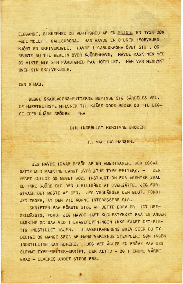 KINDLY TRANSLATE THE ATTACHED LETTER, BUT ONLY EXCERPTS. THE GOOD DENSMORE IS A BIT OF A CHATTERBOX; IT IS NOW FOR THE THIRD TIME THAT HE IS TELLING ME ABOUT HIS INCOMPETENCE IN THE GERMAN LANGUAGE. THE OTHER DAY I HAD THE PLEASURE OF SEEING MY MACHINE BEING HANDLED WITH EXCELLENT ELEGANCE, SKILL AND SPEED BY A BLIND, A GERMAN CONSUL WOLLF IN CARLSKRONA. HE HAD 3 THREE WEEKS BEFORE BOUGHT A WRITING BALL, HAD PRACTISED IN CARLSKRONA AND WAS NOW TRAVELLING TO BERLIN, PASSING THROUGH COPENHAGEN, HE BROUGHT HIS MACHINE AND SHOWED ME HIS SKILL AT A DEMONSTRATION AT THE HOTEL. HAN WAS DELIGTHED WITH HIS WRITING BALL.
