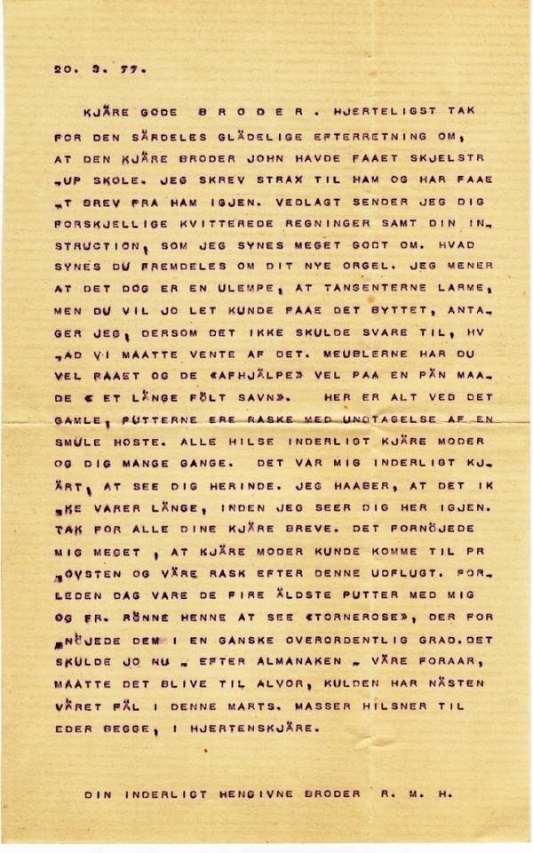 [2] CB: I wonder what the brother needs an organ for? SA: The teachers probably played to accompany hymn singing at school. The other brother, Johan Fredrik, was an organist and RMH himself also played the instrument