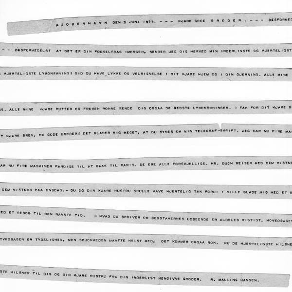 C O P E N H A G E N JUNE 2, 1878 - - - MY DEAR B R O T H E R[2]. - - -SINCE TOMORROW IS YOUR BIRTHDAY PLEASE RECEIVE MY WARMEST AND MOST HEARTFELT CONGRATULATIONS: MAY YOUR DEAR HOME AND YOUR WORK BE BLESSED AND FILLED WITH HAPPINESS. ALL MY DEAR GIRLS AND MISS RÖNNE[3]SEND THEIR BEST CONGRATULATIONS. – THANK YOU SO MUCH FOR YOUR LETTER, DEAR BROTHER: I AM VERY PLEASED TO HEAR THAT YOU LIKE MY TELEGRAPH PRINT. BY NOW I HAVE FOUR MACHINES READY FOR SHIPMENT TO PARIS[4]. THEY ALL DIFFER FROM EACH OTHER. MR DUCH WILL CARRY THEM, PROBABLY TRAVELLING ON WEDNESDAY. – I AM GRATEFUL TO YOU AND YOUR DEAR WIFE FOR GIVING ME THE PLEASURE OF YOUR COMPANY AT THE SAME TIME. – YOUR COMMENT ABOUT THE APPEARANCE OF THE LETTERS IS VERY MUCH CORRECT, THE MAIN THING IS DISTINCTNESS, HOWEVER THERE MUST BE BEAUTY AS WELL. AND I THINK IT WILL BE THAT WAY. WARMEST GREETINGS TO YOU AND YOUR DEAR WIFE FROM YOUR DEEPLY DEVOTED BROTHER.R. MALLING HANSEN