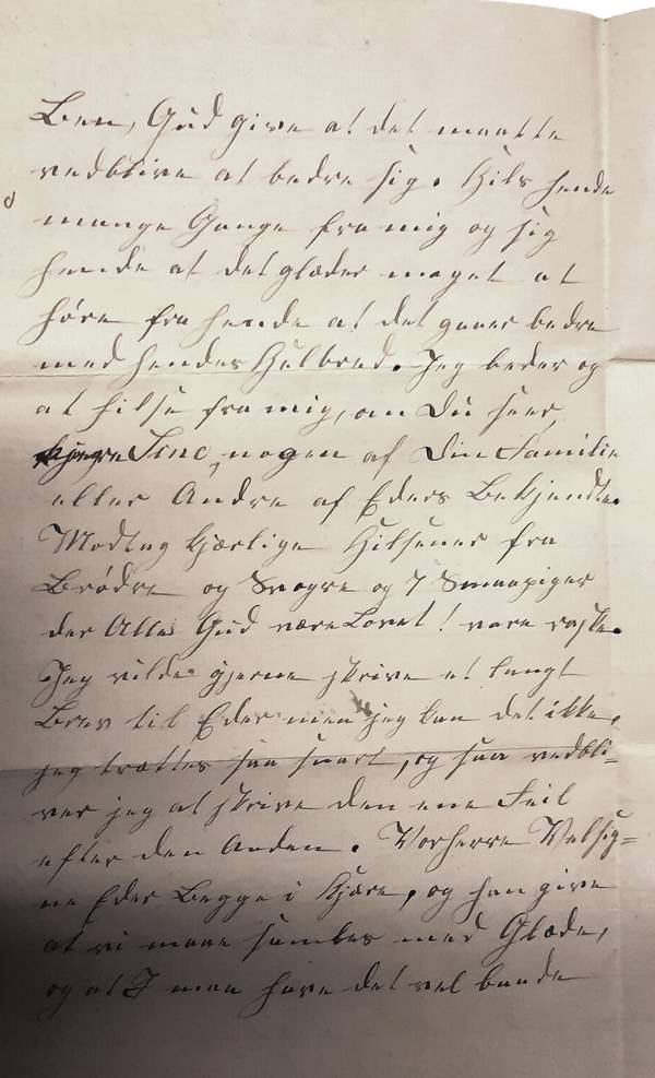 Jeg vilde gjerne skrive et langt Brev til Eder men jeg kan det ikke, jeg trættes saa snart, og saa vedbliver jeg at skrive ................ Vorfader velsigne Eder... i Kjære, og han give at vi maa samles med Glæde, og at I maa have det ...baade i Eders hjem og have Glæde af ...begge Steder. Jeg tør snart nok sende et Brev fra Eder.........Nu de hjærteligste Hilsener til Eder begge to fra