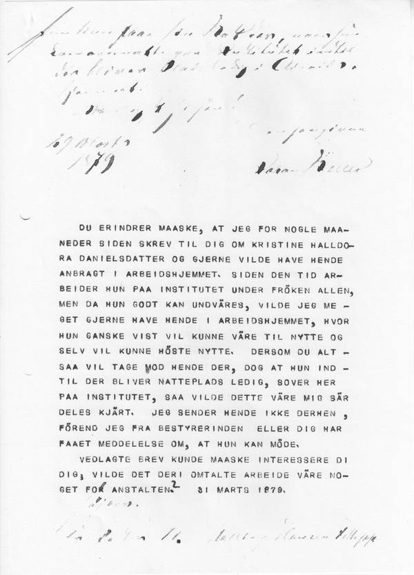 [1]PERHAPS YOU RECALL THAT A COUPLE OF MONTHS AGO I WROTE TO YOU CONCERNING KRISTINE HALLDORA DANIELSDATTER AND THAT I WOULD LIKE TO HAVE HER ACCOMMODATED AT THE CASUAL WARD. SINCE THEN SHE HAS BEEN WORKING AT THE INSTITUTE UNDER MISS ALLEN, BUT SINCE SHE CAN BE DISPENSED WITH I WOULD BE HAPPY TO HAVE HER LODGED AT THE CASUAL WARD, WHERE SHE CAN CERTAINLY BE USEFUL AND ALSO DRAW SOME BENEFIT HERSELF. HENCE, IF YOU COULD KINDLY RECEIVE HER THERE, HOWEVER SHE WOULD CONTINUE TO BE PUT UP FOR THE NIGHT AT THE INSTITUTE UNTIL SUCH TIME THAT THERE IS OVERNIGHT ACCOMMODATION AVAILABLE, I WOULD BE VERY GRATEFUL. I SHALL NOT SEND HER OVER THERE UNTIL I RECEIVE A NOTE FROM THE MATRON OR FROM YOU THAT SHE IS WELCOME. THE ENCLOSED LETTER[2] MIGHT PERHAPS INTEREST YOU; WOULD THE TASK REFERRED TO BE OF INTEREST TO THE INSTITUTE? 31 MARCH 1879.