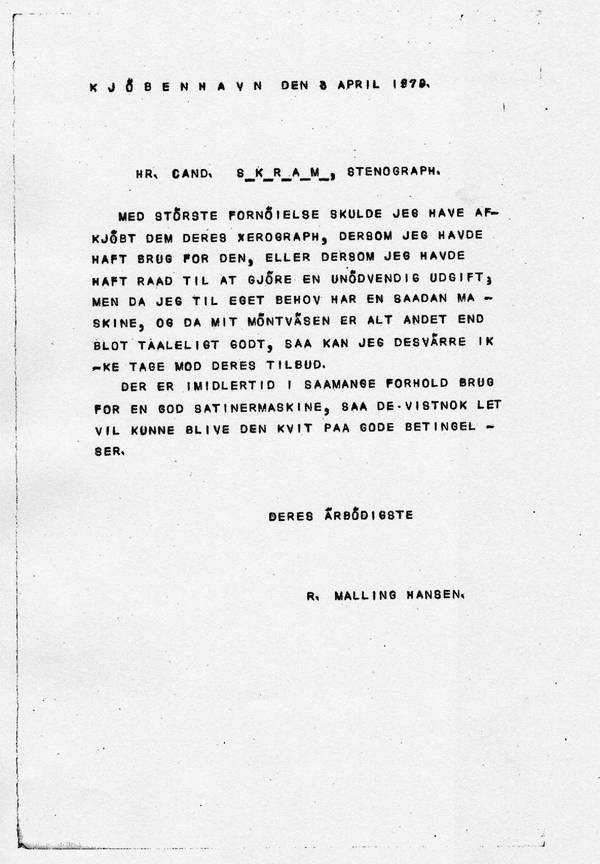 (SA): According to the Royal Library this letter is addressed to Erik Skram. Around this time there was a writer in Denmark by the name of Erik Skram (1847-1923), and he worked as a stenographer and editor of the records of parliamentary debates from 1872 until 1918. In all probability this letter is addressed to him. Apart from being a writer, Skram was also a very well known cultural celebrity, and he married the Norwegian writer Amalie Skram, née Müller. Incidentally, it seems to me that Malling-Hansen in his letter uses the term “Xerograph” as synonymous with “glazing machine”. That seems to indicate that Malling-Hansen was aware that Mr Skram knew the concept of “Xerography”. Perhaps he had copied documents, using Malling-Hansen’s method?