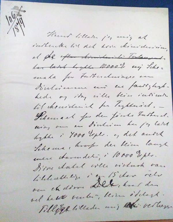 Herved tillader jeg mig at indberette til det høie Ministerium at de ny Schemata for Indberetninger om Døvstumme nu ere færdigtrykkede og idag vilde blive indsendte til Ministeriet fra Trykkeriet. – Schemaet for den første Indberetning om en Døvstum har jeg ladet trykke i 4000 Expl. og det andet Schema, hvorfor der bliver langt mere Anvendelse, i 10 000 Expl. Disse Antal ville vistnok være tilstrækkelige i en 15 Aar selv om en større Del, hvad der vel kan ventes, bliver ødelagt.