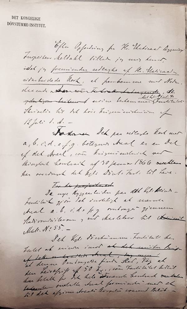 Det paa vedlagte Kort med a,b,c,d,e,f,g betegnede Areal er en Del af det Areal, som Krigsministeriet ved thinglæst Contract af 30 januar 1866 har overdraget til det Kgl. Døvst. Inst. til Leie.