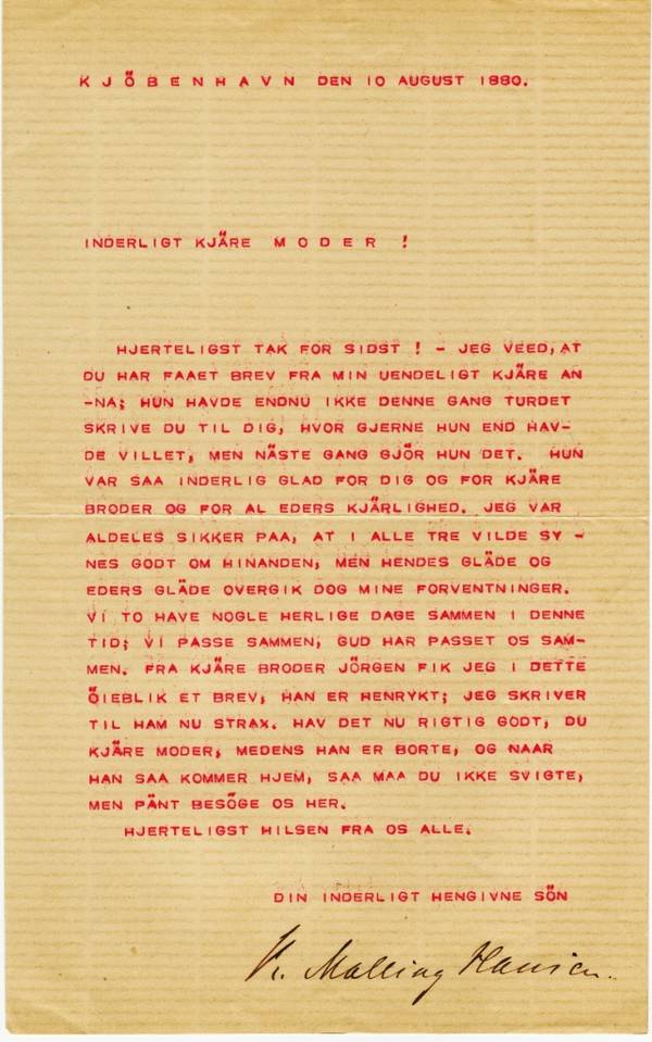 HJERTELIGST TAK FOR SIDST ! JEG VEED, AT DU HAR FAAET BREV FRA MIN UENDELIGT KJÄRE ANNA! HUN HAVDE ENDNU IKKE DENNE GANG TURDET SKRIVE DU TIL DIG, HVOR GJERNE HUN END HAVDE VILLET, MEN NÄSTE GANG GJÖR HUN DET. HUN VAR SAA INDERLIG GLAD FOR DIG[1] OG FOR KJÄRE BRODER OG FOR AL EDERS KJÄRLIGHED. JEG VAR ALDELES SIKKER PAA, AT I ALLE TRE VILDE SYNES GODT OM HINANDEN, MEN HENDES GLÄDE OG EDERS GLÄDE OVERGIK DOG MINE FORVENTNINGER.