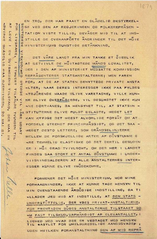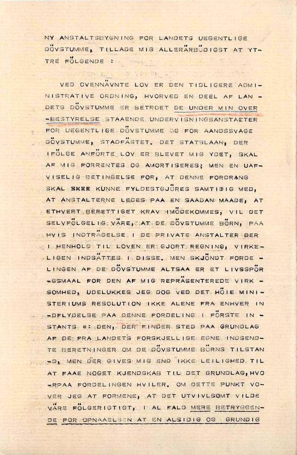 IN CONNECTION WITH THE MINISTRY RESOLUTION DATED THE14TH OF THIS MONTH CONCERNING REGULATIONS FOR THE SELECTION AND DISTRIBUTION OF DEAF-MUTE FOR EDUCATION AT THE INSTITUTE AT FREDERICIA , RESPECTIVELY THE TWO INSTITUTIONS FOR THE DEAF-MUTE IN COPENHAGEN[4] I HUMBLY BEG TO COMMENT AS FOLLOWS, AVOIDING ANY VIEWS CONCERNING THE PRINCIPLE OF THE SELECTION, WHICH HAS ALREADY BEEN ESTABLISHED BY LAW OF MARCH 22 1880 ABOUT THE ESTABLISHMENT OF A PUBLIC INSTITUTION IN FREDERICIA AS WELL AS CONCERNING A GOVERNMENT LOAN TO ME FOR THE PURPOSE OF ERECTING A NEW INSTITUTION BUILDING FOR THE NOT COMPLETELY DEAF-MUTE PUPILS: