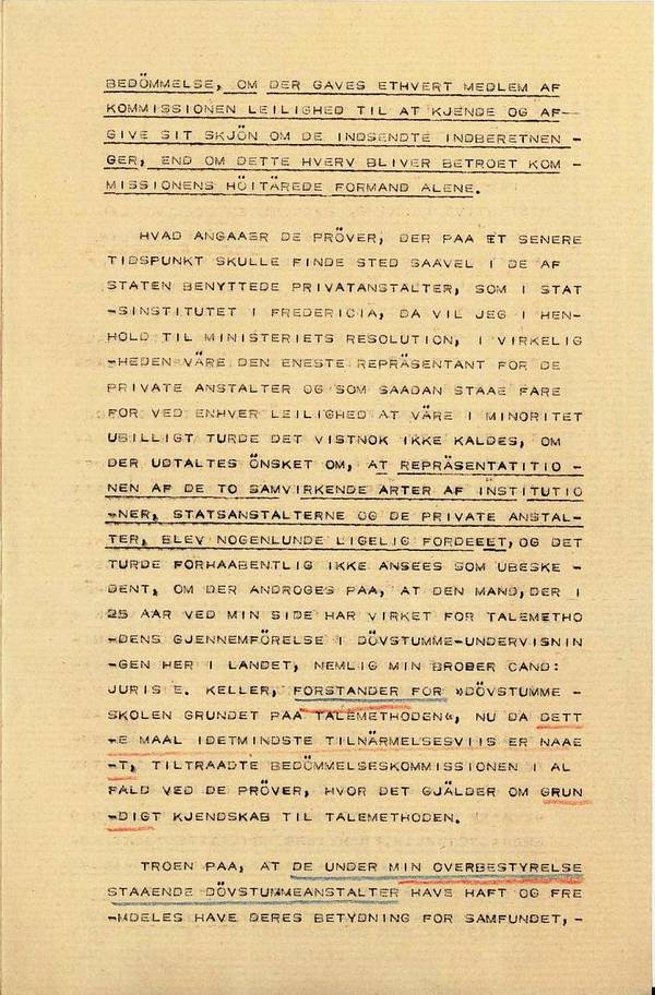 CONCERNING THE EXAMINATIONS, DUE TO TAKE PLACE AT A LATER STAGE AT THE PRIVATE INSTITUTIONS USED BY THE GOVERNMENT, AS WELL AS AT THE GOVERNMENT INSTITUTION IN FREDERICIA, ACCORDING TO THE MINISTERIAL DECISION, IN REALITY I WILL BE THE ONLY REPRESENTATIVE OF THE PRIVATE INSTITUTIONS AND, AS SUCH, AT EACH OPPORTUNITY I WILL BE AT RISK OF BEING IN THE MINORITY. IT COULD HARDLY BE CONSIDERED UNREASONABLE IF WE EXPRESS THE WISH TO SEE A MORE EQUAL REPRESENTATION BY THE TWO CO-OPERATING PARTNERS, REPRESENTING PUBLIC AND PRIVATE INSTITUTIONS. LIKEWISE, IT SHOULD NOT BE SEEN AS IMMODERATE TO ARGUE THAT THE PERSON WHO FOR 25 YEARS HAS WORKED BY MY SIDE FOR THE INTRODUCTION OF THE SPEECH METHOD IN THE EDUCATION OF THE DEAF-MUTE IN THIS COUNTRY, MY BROTHER, BACHELOR OF LAWS E KELLER, PRINCIPAL OF THE “INSTITUTION FOR THE DEAF-MUTE, BASED ON THE SPEECH-METHOD”, NOW THAT WE ARE AT LEAST THIS CLOSE TO THE GOAL, SHOULD BE PERMITTED TO ASSIST THE ASSESSMENT COMMISSION, AT LEAST AT THE EXAMINATIONS WHERE A THOROUGH KNOWLEDGE OF THE SPEECH-METHOD IS CALLED FOR.