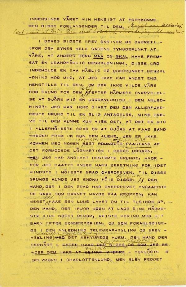 I DERES SIDSTE BREV SKRIVER DE ORDRET: -”FOR DEM SYNES HELE SAGENS TYNGDEPUNKT AT VÄRE, AT ANDERS BORG MAA OG SKAL HAVE FREMSAT EN USANDFÄRDIG BESKYLDNING. DISSE ORD INDEHOLDE EN SAA HÄSLIG OG UBEGRUNDET BESKYLDNING MOD MIG, AT JEG IKKE KAN ANDET END HENSTILLE TIL DEM, OM DER IKKE VILLE VÄRE GOD GRUND FOR DEM TIL EFTER NÄRMERE OVERVEIELSE AT GJÖRE MIG EN UNDSKYLDNING I DEN ANLEDNING?- JEG HAR IKKE GIVET DEM DEN ALLERFJERNESTE GRUND TIL EN SLIG ANTAGELSE. MINE BREVE TIL DEM KUNNE KUN VISE DET, AT DET ER MIG I ALLERHÖIESTE GRAD OM AT GJÖRE AT FAAE SANDHEDEN FREM OG KUN DEN ALENE. JEG ER IKKE KOMMEN MED NOGEN PAASTAND AF DET FORMODEDE LÖGNAGTIGE I BORGS UDSAGN, JEG HAR ANGIVET BESTEMTE GRUNDE, HVORFOR JEG MAATTE ANSEE HANS BERETNING FOR I DET MINDSTE I HÖIESTE GRAD OVERDREVEN. TIL DISSE GRUNDE KUNDE JEG ENDNU FÖIE FÖLGENDE: DEN MAND, DER I DEN GRAD HAR OVERDREVET ANGAAENDE DE SAAR SOM BARNET HAVDE PAA KROPPEN, KAN MEGET LET FAAE EEN LUS LAVET OM TIL TUSINDE D0.- [3] DEN MAND, DER IFJOR UDEN AT LADE SINE NÄRMESTE VIDE NOGET DEROM, REISTE HERIND MED SIT BARN EFTER SOMMERFERIEN, OG SOM FORANLEDIGEDE I DEN ANLEDNING TELEGRAFVEXLING OG BREVVEXLING MELLEM INSTITUTET OG DET BEKYMREDE HJEM, DEN MAND DER DERNÄST – EFTER HVAD DER SIGES, OG SOM JEG BEDER DEM IKKE AT OMTALE - FORSÖGTE SELVMORD I CHARLOTTENLUND, MEN BLEV REDDET DEFRA, DENNE MAND TÖR DOG NOK ANTAGES FOR AT VÄRE EN EXALTERET OG IKKE GANSKE PAALIDELIG PERSON. NAAR DE NU HR: DOCTOR HERTIL BEHAGER AT LÄGGE, HVAD JEG YDERLIGERE HAR GJORT FOR AT FAAE SAND KLARHED I SAGEN, SAA – SOM SAGT, TÖR JEG VEL MED NOGEN BILLIGHED VENTE EN LILLE UNDSKYLDNING FRA DEM FOR DEN GROVE FORNÄRMELSE, DE HAR TILFÖIET MIG VED DEN OVENFOR CITEREDE SÆTNING.
