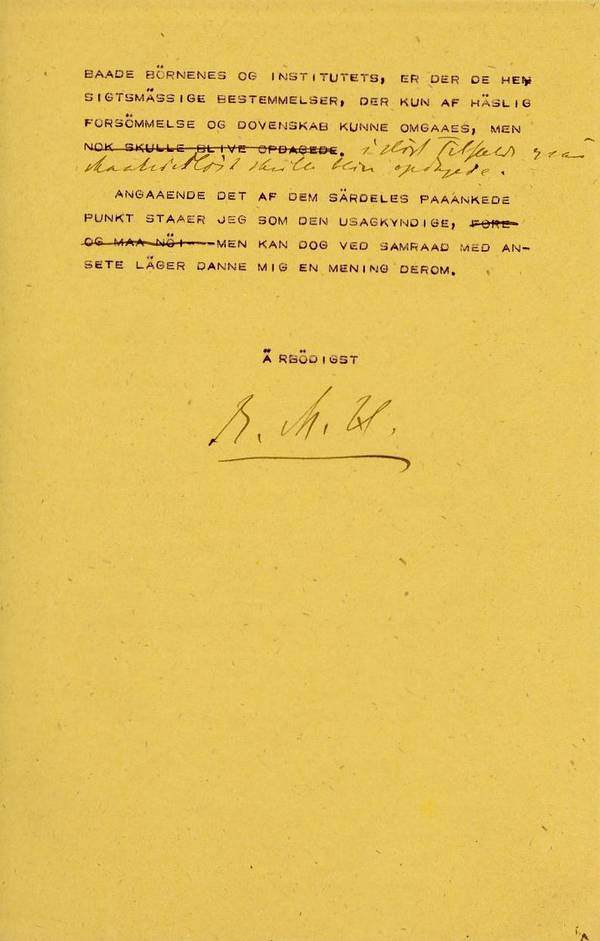 JEG TILLOD MIG AT SENDE DEM NOGLE OPTEGNELSER ANGAAENDE SUNDHEDSTILSTANDEN HERUDE PAA INSTITUTET. DET VIL MAASKE DERAF FREMGAAE, AT JEG I ALVOR HAR DRAGET OMSORG FOR ELEVERNES SUNDHEDSTILSTAND I DE 16 AAR JEG HAR VÄRET FORSTANDER HER. KOMMER DE NOGENSINDE TIL FREDERICIA[4] VIL ET BESÖG PAA INSTITUTET OVERBEVISE DEM OM AT ALLE NUTIDENS FORDRINGER I HYGIENISK HENSEENDE DER ERE BLEVNE GJENNEMFÖRTE. JEG SKAL ENDNU TILFÖIE FÖlGENDE. JEG HAR FORANLEDIGET, AT INTSTITUTETS LÄGE NU ER PAA EN UDENLANDSREISE FOR AT HENTE OPLYSNINGER ANGAAENDE SUNDHEDSFORHOLDENE PAA LIGNENDE INSTITUTIONER M.M. SIDEN AARET EFTER AT JEG KOM HERTIL BLIVE ALLE NYANKOMNE BÖRN HER UNDERKASTEDE EN GRUNDIG LÄGEUNDERSÖGELSE. HVERT ENESTE BARN, DER FEILER DET ALLERMINDSTE, BLIVER STRAX AF LÄRER ELLER VEDKOMMENDE SENDT PAA SYGESTUEN, HVOREFTER LÄGEN BESTEMMER ANG: BARNET. JEG HAR I NÄSTFORRIGE AAR ANSTILLET OVER 40000 MAALINGER AF ELEVERNE HER, I HOVEDSAGEN AF HENSYN TIL AT KOMME I KLARHED OVER ET ENKELT PUNKT I BÖRNENES SUNDHEDSTILSTAND. PAA PLANEN TIL ET NYT REGLEMENT HER ER DER OPTAGET LOCALER VED SOVESALEN TIL VEINING OG MAALING AV BØRNENE OSV. OSV. [5]ANGAAENDE REENLIGHEDEN HER, BAADE BÖRNENES OG INSTITUTETS, ER DER DE HENSIGTSMÄSSIGE BESTEMMELSER, DER KUN AV HÄSLIG FORSÖMMELSE OG DOVENSKAB KUNNE OMGAAES MEN NOK SKULLE BLIVE OPDAGEDE.
