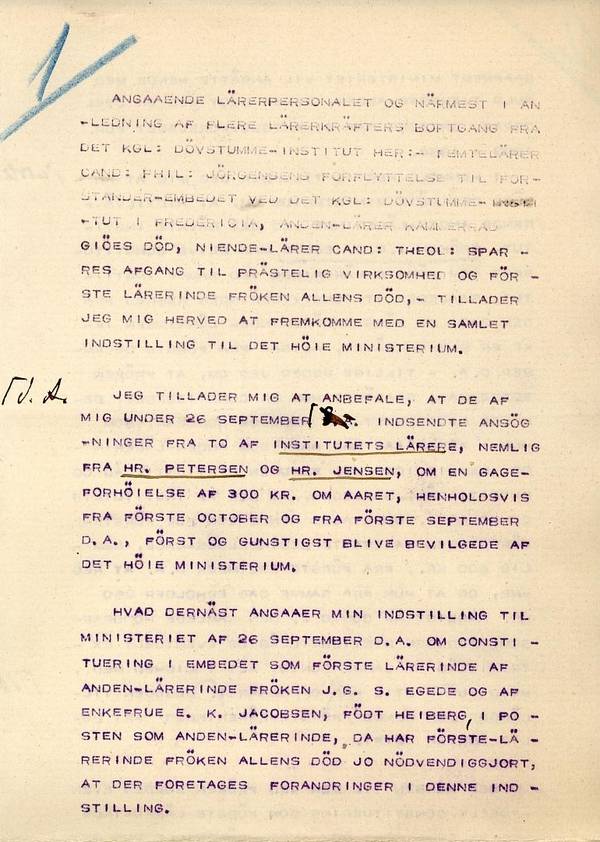 ANGAAENDE LÄRERPERSONALET OG NÄRMEST I ANLEDNING AF FLERE LÄRERKRÄFTERS BORTGANG FRA DET KGL: DÖVSTUMME-INSTITUT HER: - FEMTELÄRER CAND: PHIL: JÖRGENSEN FORFLYTTES TIL FORSTANDER-EMBEDET VED DET KGL: DÖVSTUMME-INSTITUT I FREDERICIA[1], ANDEN-LÄRER KAMMERRAAD GIÖES DÖD, NIENDE-LÄRER CAND: THEOL: SPARRES AFGANG TIL PRÄSTELIG VIRKSOMHED OG FÖRSTE LÄRERINDE FRÖKEN ALLENS DÖD, - TILLADER JEG MIG HERVED AT FREMKOMME MED EN SAMLET INDSTILLING TIL DET HÖIE MINISTERIUM.