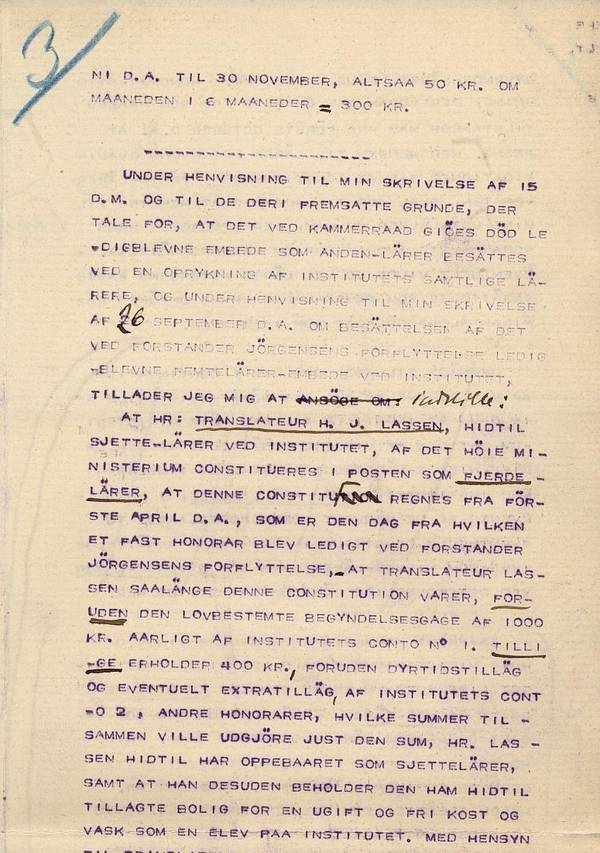 AT HR: TRANSLATEUR H. J. LASSEN,[5] HIDTIL SJETTE-LÄRER VED INSTITUTET, AF DET HÖIE MINISTERIUM CONSTITUERES I POSTEN SOM FJERDELÄRER, AT DENNE CONSTITUTION REGNES FRA FÖRSTE APRIL D. A., SOM ER DEN DAG FRA HVILKEN ET FAST HONORAR BLEV LEDIG VED FORSTANDER JÖRGENSENS FORFLYTTELSE, - AT TRANSLATEUR LASSEN SAALÄNGE DENNE CONSTUTISTION VARER, FORUDEN DEN LOVBESTEMTE BEGYNDELSESGAGE AF 1000 KR. AARLIGT AF INSTITUTETS CONTO NO 1. TILLIGE ERHOLDER 400 KR., FORUDEN DYRTIDSTILLÄG OG EVENTUELT EXTRATILLÄG, AF INSTITUTETS CONTO 2, ANDRE HONORARER, HVILKE SUMMER TILSAMMEN VILLE UDGJÖRE JUST DEN SUM, HR. LASSEN HIDTIL HAR OPPEBAARED SOM SJETTELÄRER, SAMT AT HAN DESUDEN BEHOLDER DEN HAM HIDTIL TILLAGTE BOLIG FOR EN UGIFT OG FRI KOST OG VASK SOM EN ELEV PAA INSTITUTET. MED HENSYN TIL TRANSLATEUR LASSENS QVALIFICATIONER TIL DENNE POST SKULDE JEG TILLADE MIG AT HENVISE TIL MINE ANBEFALENDE UDTALELSER OM HAM I SIDSTNÄVNTE SKRIVELSE AF 26 SEPTEMBER D. A. – JEG MAA HER TILLIGE FREMHÄVE, AT LÄRER LASSENS CONSTITUERING SOM FJERDE-LÄRER IKKE VIL NÖDVENDIGGJÖRE NOGENSOMHELST FORANDRING I DET PAA FINANTSLOVFORSLAG FOR 1882-1883 OPFÖRTE OM FAST ANSÄTTELSE FOR LASSEN SOM FEMTE-LÄRER VED INSTITUTET MED ANCIENNITET FRA FÖRSTE APRIL 1871. – DET DER BLIVER BEVILGET ER JO OVERFÖRSELEN AF HANS ANCIENNITET, HVORIMOD BENÄVNELSEN FEMTE- ELLER FJERDE-LÄRER OSV. ALENE AFHÄNGER AF LÄRERNES TJENESTEALDER I FORHOLD TIL HVERANDRE.