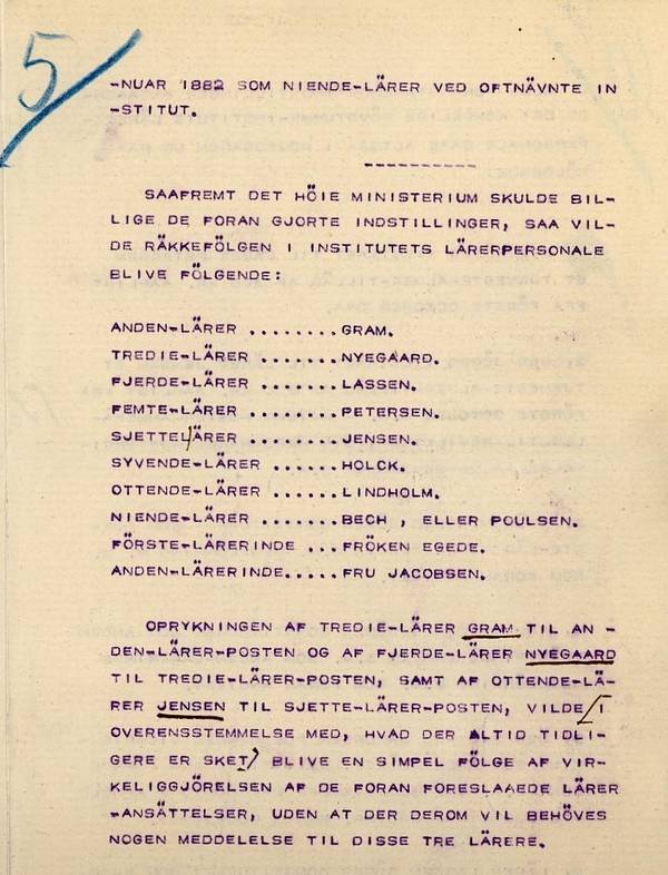 I HENHOLD TIL DET ANFÖRTE TILLADER JEG MIG AT INDSTILLE, AT SEMINARIST L. V. LINDHOLM/LÄRER I NÖRRE-ÖRSLEV PAA FALSTER/ CONSTITUERES PAA SÄDVANLIG MAADE OG OM MULIGT FRA FÖRSTE JANUAR SOM OTTENDE-LÄRER VED INSTITUTET – MED ET HONORAR AF 600 KR. OM AARET FORUDEN FRI BOLIG FOR EN UGIFT SAMT KOST OG VASK SOM EN ELEV VED INSTITUTET. ENDVIDERE TILLADER JEG MIG AT INDSTILLE, AT STUDENT FRITZ BECH /BOER I H. C. ANDERSENSGADE NO 4 KJØBENHAVN K./, ELLER LÄRER POULSEN/ BOER I VARPELÖV PR. KLIPPINGE/ PAA SAMME MAADE OG MED SAMME HONORAR M. M. CONSTITUERES AF DET HÖIE MINISTERIUM, OM MULIGT FRA FÖRSTE JANUAR 1882 SOM NIENDE-LÄRER VED OFTNÄVNTE INSTITUT.