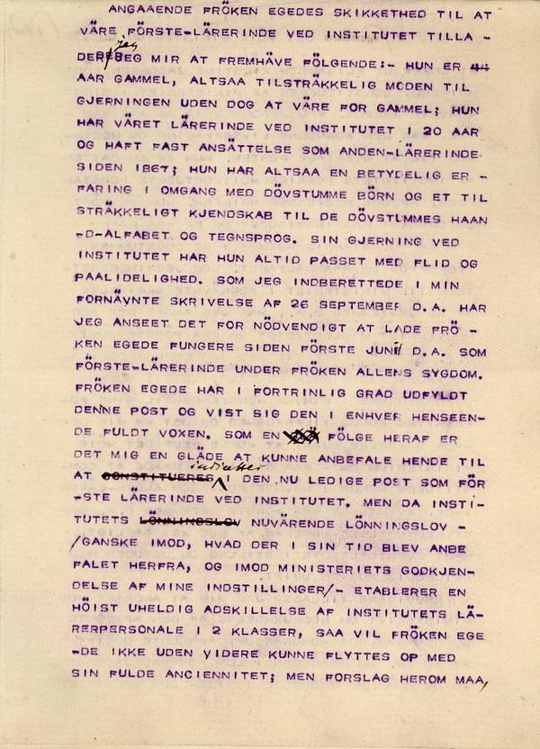 ANGAAENDE FRÖKEN EGEDES SKIKKETHED TIL AT VÄRE FÖRSTE-LÄRERINDE VED INSTITUTET TILLADER JEG MIG AT FREMHÄVE FÖLGENDE: - HUN ER 44 AAR GAMMEL, ALTSAA TILSTRÄKKELIG MODEN TIL GJERNINGEN UDEN DOG AT VÄRE FOR GAMMEL; HUN HAR VÄRET LÄRERINDE VED INSTITUTET I 20 AAR OG HAFT FAST ANSÄTTELSE SOM ANDEN-LÄRERINDE SIDEN 1867; HUN HAR ALTSAA EN BETYDELIG ERFARING I OMGANG MED DÖVSTUMME BÖRN OG ET TILSTRÄKKELIGT KJENDSKAB TIL DE DÖVSTUMMES HAAND-ALFABET OG TEGNSPROG. SIN GJERNING VED INSTITUTET HAR HUN ALTID PASSET MED FLID OG PAALIDELIGHED. SOM JEG INDBERETTEDE I MIN FORNÄVNTE SKRIVELSE AF 26 SEPTEMBER D. A. HAR JEG ANSEET DET FOR NÖDVENDIGT AT LADE FRÖKEN EGEDE FUNGERE SIDEN FÖRSTE JUNI D. A. SOM FÖRSTE-LÄRERINDE UNDER FRÖKEN ALLENS SYGDOM. FRÖKEN EGEDE HAR I FORTRINLIG GRAD UDFYLDT DENNE POST OG VIST SIG DEN I ENHVER HENSEENDE FULDT VOXEN. SOM EN FÖLGE HERAF ER DET MIG EN GLÄDE AT KUNNE ANBEFALE HENDE TIL AT INDSÄTTES I DEN NU LEDIGE POST SOM FÖRSTE LÄRERINDE VED INSTITUTET. MEN DA INSTITUTETS NUVÄRENDE LÖNNINGSLOV - /GANSKE IMOD, HVAD DER I SIN TID BLEV ANBEFALET HERFRA, OG IMOD MINISTERIETS GODKJENDELSE AF MINE INDSTILLINGER/ - ETABLERER EN HÖIST UHELDIG ADSKILLELSE AF INSTITUTETS LÄRERPERSONALE I 2 KLASSER, SAA VIL FRÖKEN EGEDE IKKE UDEN VIDERE KUNNE FLYTTES OP MED SIN FULDE ANCIENNITET; MEN FORSLAG HEROM, MAA SAAFREMT MINISTERIET VIL ANSÄTTE HENDE MED FULD TJENESTE-ALDER, ELLER BLOT MED EN DEEL DERAF, OPTAGES PAA FINANTSLOVFORSLAGET FOR 1883 – 1884.