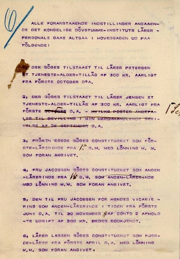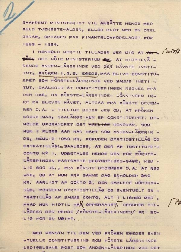 I HENHOLD HERTIL TILLADER JEG MIG AT INDSTILLE TIL DET HÖIE MINISTERIUM AT HIDTILVÄRENDE ANDEN-LÄRERINDE VED NÄVNTE INSTITUT, FRÖKEN I. G. S. EGEDE MAA BLIVE CONSTITUERET SOM FÖRSTE-LÄRERINDE VED SAMME INSTITUT, SAALEDES AT CONSTITUERINGEN REGNES FRA DEN DAG, DA FÖRSTE-LÄRERINDE - LÖNNINGEN IKKE ER BLEVEN HÄVET, ALTSAA FRA FÖRSTE DECEMBER D. A. – TILLIGE BEDER JEG OM, AT FRÖKEN EGEDE MAA, SAALÄNGE HUN ER CONSTITUERET, BEHOLDE UFORANDRET DET HONORAR, SOM HUN I FLERE AAR HAR HAFT SOM ANDEN-LÄRERINDE, NEMLIG 1050 KR. FORUDEN DYRTIDSTILLÄG OG EXTRATILLÄG; - SAALEDES, AT DER AF INSTITUTETS CONTO NO 1. UDBETALES HENDE DEN FOR FÖRSTE-LÄRERINDEN FASTSATTE BEGYNDELSES-GAGE, NEMLIG 800 KR., FRA FÖRSTE DECEMBER D. A. AT REGNE, OG AT HUN FRA SAMME DAG ERHOLDER 250 KR. AARLIGT AF CONTO 2, DEN SAMLEDE HONORARSUM, FORUDEN DYRTIDSTILLÄG OG EVENTUELT EXTRATILLÄG AF SAMME CONTO, ALT I LIGHED MED, HVAD HUN HIDTIL HAR OPPEBAARET SOM ANDEN-LÄRERINDE. DESUDEN TILLÄGGES DER HENDE /FÖRSTE-LÄRERINDES/ FRI BOLIG FOR EN UGIFT.