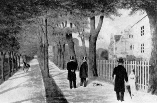 - Blindeinstituttet og Døvstummeinstituttet er meget nære naboer i Kastelsvei, som lå veldig landlig til i "gamle dager". På dette maleriet av Chr. Bayer fra 1897 ses hjørnet av Døvstummeinstituttet nærmest. Plassen som ligger mellom bygningen og veien, er av Malling-Hansen Selskabet døpt Rasmus Malling-Hansen Plads. Midt i bildet ses forstander Moldenhawer i samtale med øyenlegen, professor H. Lehmann. I forgrunnen ses Kgl. kapelmusikus Valdemar Schiøtt, instituttets musikklærer.