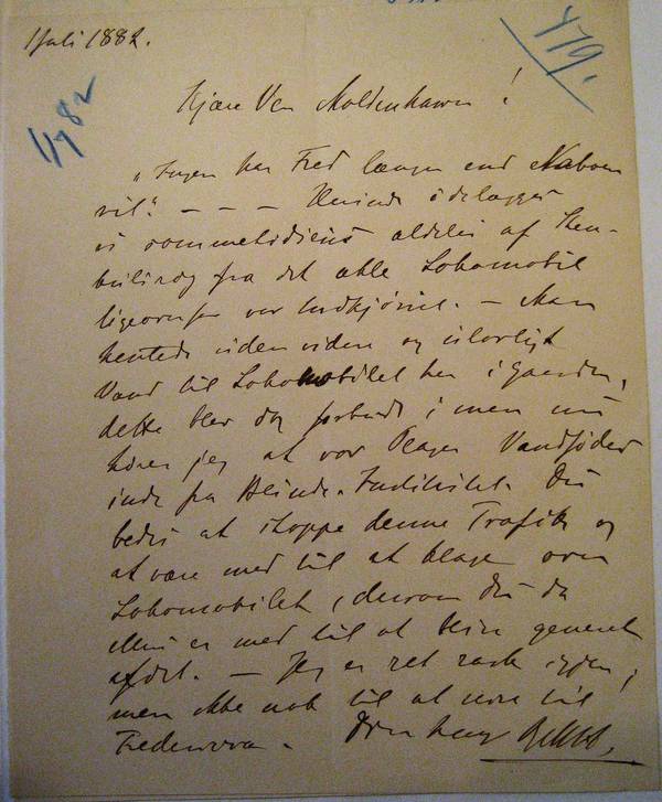 Dette håndskrevne brev – eller snarere note, besked – er fra Malling-Hansen til forstanderen for Blindeinstituttet, Johannes Moldenhawer[1], og dermed døvstummeinstituttets nærmeste nabo. Noten omtaler et køretøj som betegnes som ”lokomobil”, hvilket er ”en transportabel kraftmaskine med mekanisk drivkraft, især en på hjul monteret dampmaskine eller motor” (Ordbog over det danske sprog, perioden 1700-1950). En del ord har jeg ikke kunnet tyde, og disse er angivne med /----/. Hvis nogen læsere lykkes bedre med at tyde skriften, er jeg taknemmelig for hjælpen!