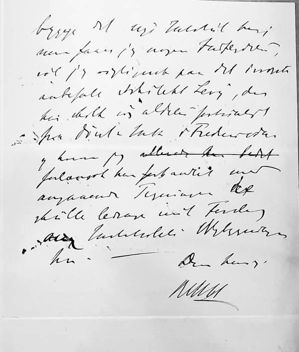 Jeg takker meget for Laanet af de tilsendte Tegninger som hermed faas tilb. – Det bliver jo ikke mig, der kommer til at afgjøre, hvem der skal bygge det nye Institut her; men faar jeg nogen .........vil jeg rigtignok paa det ivrigste anbefale Arkitekt Levy, der har .......sig aldeles fortrinligt paa Døvst.Inst. i Fredericia, og hvem jeg forlængst har forhandlet med angaaende Tegninger der skulle ledsage mit Forslag ang. Institutets Nybygninger her.