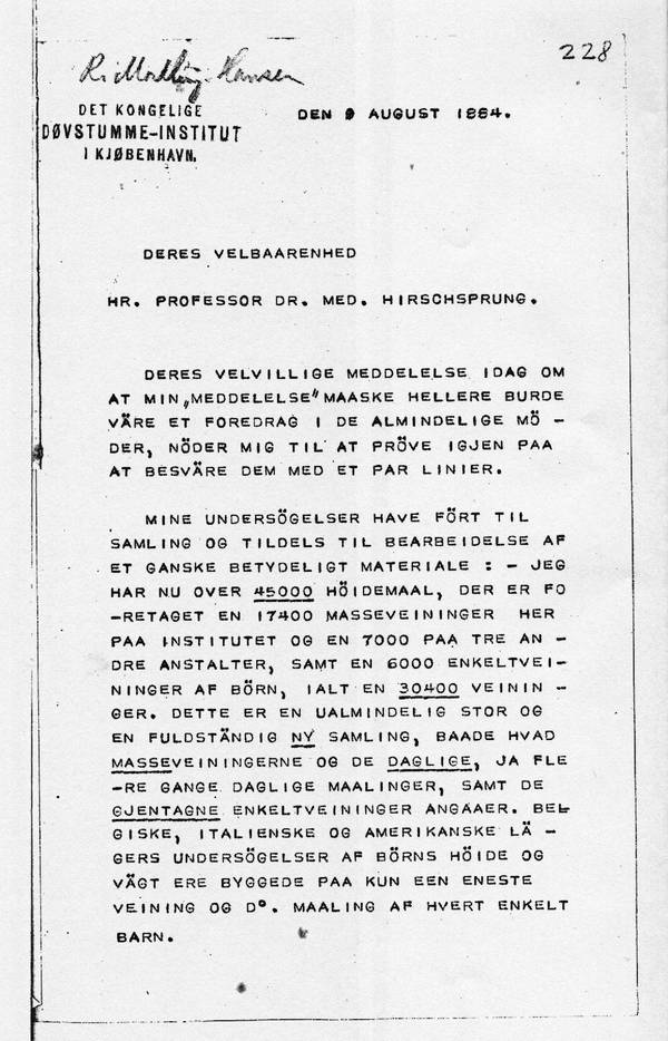 MINE UNDERSÖGELSER HAVE FÖRT TIL SAMLING OG TIL DELS TIL BEARBEIDELSE AF ET GANSKE BETYDELIG MATERIALE : - JEG HAR NU OVER 45000 HÖIDEMAAL, DER ER FORETAGET EN 17400 MASSEVEININGER HER PAA INSTITUTET OG EN 7000 PAA TRE ANDRE ANSTALTER, SAMT EN 6000 ENKELTVEININGER AF BÖRN, I ALT EN 30400 VEININGER. DETTE ER EN UALMINDELIG STOR OG EN FULDSTÄNDIG NY SAMLING, BAADE HVAD MASSEVEININGERNE OG DE DAGLIGE, JA FLERE GANGE DAGLIGE MAALINGER, SAMT DE GJENTAGNE ENKELTVEININGER ANGAAER. BELGISKE, ITALIENSKE OG AMERIKANSKE LÄGERS UNDERSÖGELSER AF BÖRNS HÖIDE OG VÄGT ERE BYGGEDE PAA KUN EEN ENESTE VEINING OG D°. MAALING AF HVERT ENKELT BARN.
