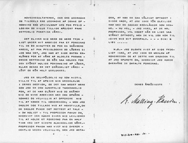 I REMAIN, OF COURSE, AT DISPOSITION TO PRESENT MY ADDRESS IN YOUR SECTION, SO MUCH MORE SINCE I AM IMMENSELY GRATEFUL TO YOU FOR PROVIDING ME AND MY RESEARCH WORK THE PLEASURE AND HONOUR OF PAYING ME ATTENTION AND ENCOURAGING ME TO ADDRESS THE CONGRESS; - HOWEVER, I AM TAKING THE LIBERTY TO KINDLY REQUEST WHETHER YOU WOULD FIND IT PROPER TO APPROACH – IF POSSIBLE – PROFESSOR PANUM WITH THE QUESTION WHETHER I COULD BE ALLOWED THE OPPORTUNITY TO GIVE A THIRTY MINUTES LECTURE AT THE LAST GENERAL ASSEMBLY. – PROFESSOR PANUM HAS SHOWN ME AN EXTRAORDINARY DEGREE OF KINDNESS AND FAVOUR; BUT I TAKE IT THAT HE IS SO VERY BUSY THESE DAYS THAT I DARE NOT INCONVENIENCE HIM WITH SUCH A LONG EPISTLE AS THIS. – WELL, - I AM WELL AWARE THAT YOU, PROFESSOR, ARE PERHAPS EQUALLY ENGAGED; BUT YOU WILL FORGIVE THAT I AM JUMPING UPON YOU LIKE THIS, WON’T YOU?. - - -DIXI & LIB:…..