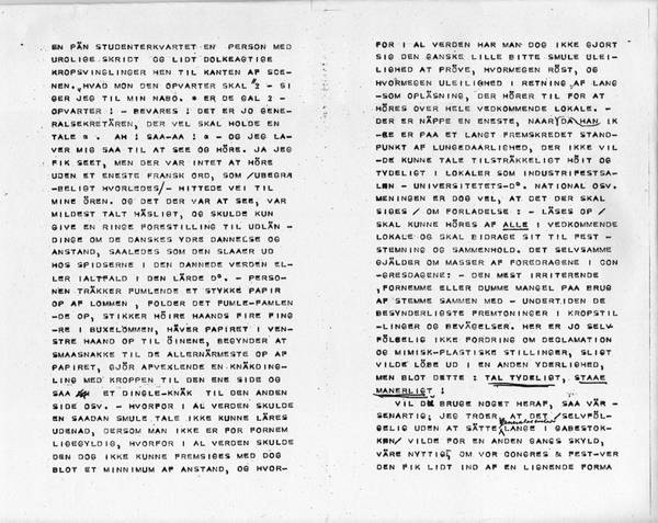JEG VIL TAGE ET FAST UDGANGSPUNKT. - VED FESTEN I NATIONAL TRAADTE EFTER EN PÄN STUDENTERKVARTET EN PERSON MED UROLIGE SKRIDT OG LIDT DOLKE-AGTIGE KROPSVINGLINGER HEN TIL KANTEN AF SCENEN. ”HVAD MON DEN OPVARTER SKAL? ” SIGER JEG TIL MIN NABO. ”ER DE GAL? – OPVARTER; BEVARES! DET ER JO GENGERALSEKRETÄREN, DER VEL SKAL HOLDE EN TALE”. AH! SAA-AA!” OG JEG LAVER MIG SAA TIL AT SEE OG HÖRE. JA JEG FIK SEET, MEN DER VAR INTET AT HÖRE UDEN ET ENESTE FRANSK ORD, SOM /UBEGRIBELIGT HVORLEDES/ HITTEDE VEI TIL MINE ÖREN[7]. OG DET DER VAR AT SEE, VAR MILDEST TALT HÄSLIGT, OG SKULDE KUN GIVE EN RINGE FORESTILLING TIL UDLÄNDIGE OM DE DANSKES YDRE DANNELSE OG ANSTAND SAALEDES SOM DEN SLAAR UD HOS SPIDSERNE I DEN DANNEDE VERDEN ELLER I ALT FALD I DEN LÄRDE Do[8]. – PERSONEN TRÄKKER FUMLENDE ET STYKKE PAPIR OP AF LOMMEN, FOLDER DET FUMLE-FAMLENDE OP, STIKKER HÖIRE HAANDS FIRE FINGRE I BUXSELOMMEN, HÄVER PAPIRET I VENSTRE HAAND OP TIL ÖJNENE, BEGYNDER AT SMAASNAKKE TIL DE ALLERNÄRMESTE OP AF PAPIRET, GJÖR AFVEXLENDE EN KNÄKDINGLING MED KROPPEN TIL DEN ENE SIDE OG SAA ET DINGLE-KNÄK TIL DEN ANDEN SIDE OSV. – HVORFOR I ALVERDEN SKULLE EN SAADAN SMULE TALE IKKE KUNDE LÄRES UDENAD, DERSOM MAN IKKE ER FOR FORNEM LIGEGYLDIG, HVORFOR I AL VERDEN SKULDE DEN DOG IKKE KUNDE FREMSIGES MED DOG BLOT ET MINNIMUM AF AFSTAND, OG HVORFOR I AL VERDEN HAR MAN DOG IKKE GJORT SIG DEN GANSKE LILLE BITTE SMULE ULEILIGHED AT PRÖVE, HVORMEGEN RÖST, OG HVOR MEGEN ULEILIGHED I RETNING AF LANGSOM OPLÄSNING, DER HÖRER TIL FOR AT HÖRES OVER HELE VEDKOMMENDE LOKALE. – DER ER NÄPPE EN ENESTE, NAAR HAN DA IKKE ER PAA ET LANGT FREMSKREDET STANDPUNKT AF LUNGEDAARLIGHED, DER IKKE VILDE KUNNE TALE TILSTRÄKKELIGT HÖJT OG OG TYDELIGT I LOKALER SOM INDUSTRIFESTSALEN – UNIVERSITETETS Do. NATIONAL OSV. MENINGEN ER DOG VEL, AT DET DER SKAL SIGES / OM FORLADELSE : LÄSES OP / SKAL KUNNE HÖRES AF ALLE I VEDKOMMENDE LOKALE OG SKAL BIDRAGE SIT TIL FESTSTEMNING OG SAMMENHOLD. DET SELVSAMME GJÄLDER OM MASSER AF FOREDRAGENE I CONGRESDAGENE: - DEN MEST IRRITERENDE FORNEMME ELLER DUMME MANGEL PÅ BRUG AF STEMME SAMMEN MED – UNDERTIDEN DE BESYNDERLIGSTE FREMTONINGER I KROPSTILLINGER OG BEVÄGELSER. HER ER JO SELVFÖLGELIG IKKE FORDRING OM DECLAMATION OG MIMISK-PLASTISKE STILLINGER, SLIGT VILDE LÖSE UD I EN ANDEN YDERLIGHED, MEN BLOT DETTE: TAL TYDELIGT, STAAE MANERLIGT !