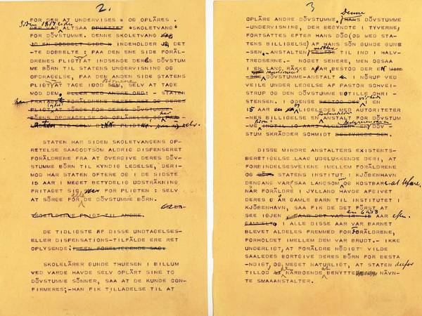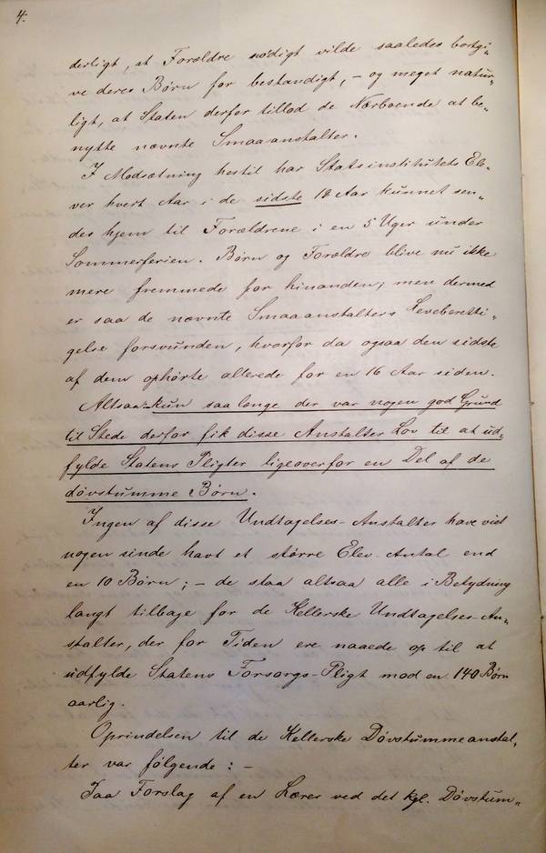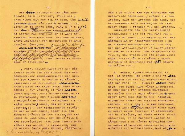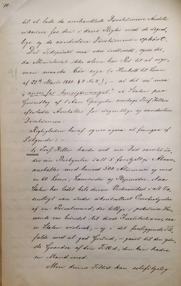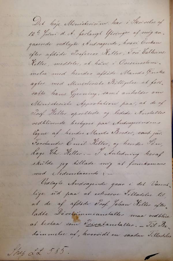 Vedlagte Andragende gaar i det Væsentlige ud paa at erhverve Tilladelse til, at de af afdøde Prof. Johan Keller efterladte Døvstummeanstalter maa vedblive at bestaa som Privatanstalter. – Til Bedømmelse af, hvorvidt en saadan Tilladelse vil kunne gives, maa jeg først fremdrage nogle Træk af Døvstumme-Undervisningens Historie her i Landet.