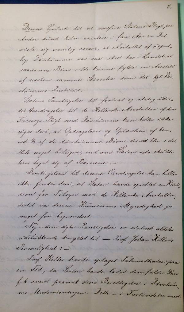 Statens Berettigelse til fortsat og stadig udvidet Overdragelse til de Kellerske Anstalter af dens Forsorgs-Pligt mod Døvstumme kan heller ikke søges deri, at Opdragelsen og Oplærelsen af henved ⅓ af de døvstumme Børn derved blev i det Hele noget billigere, end om Staten selv skulde have taget sig af Børnene.-