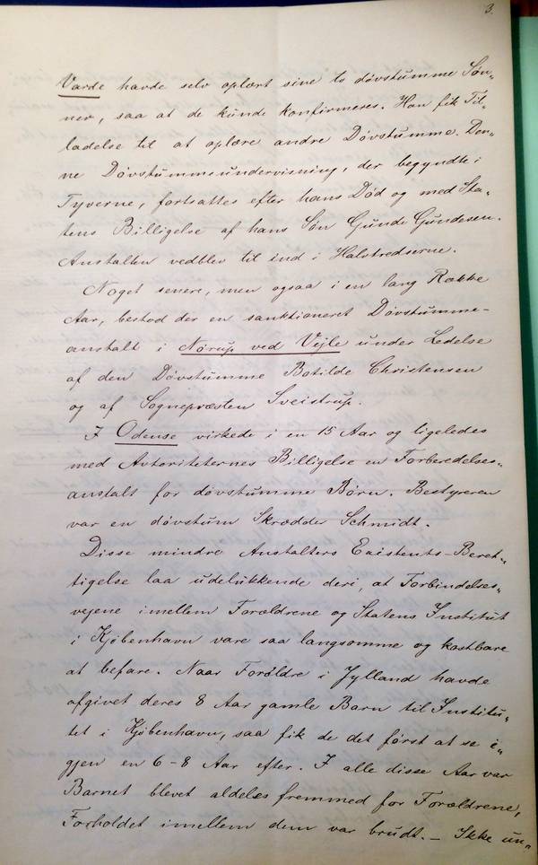 3. TIL GUNST FOR STATENS OVERTAGELSE AF DE OMHANDLEDE ANSTALTER SKAL JEG ENDNU TILLADE MIG AT ANFÖRE DETTE: SIDEN MINISTERIETS RESOLUTION AF 5 JANUAR 1867, OG ENDNU MERE SIDEN OPRETTELSEN IFÖLGE LOV AF 22 MARTS 1880 AF INST. I FREDERICIA, ER DANMARK MED HENSYN TIL OMSORG FOR SINE DÖVSTUMME NAAET VIDT FREM FOR ALLE ANDRE LANDE. MEN SOM ORDNINGEN AF DENNE SAG I DET HELE ER EN MÖNSTERORDNING, OG ANERKJENDES OM EN SAADAN, SAALEDES BÖR OGSAA DE PAA DENNE ORDNING BYGGEDE ANSTALTER SNART VISE SIG SOM MÖN-STERANSTALTER – TIL BEVIS FOR ANDRE LANDE PAA, HVAD DER KAN OG BÖR TILSTRÆ-BES. MEN DETTE NAAER STATEN VISTNOK BEDST VED UDELUKKENDE AT HAVE ALLE DE VEDKOMMENDE 4 ANSTALTER I EGEN HAAND, SAALEDES OM DEN JO FORÖVRIGT VED OPRETTELSEN AF SKOLETVANG SELV HAR PAALAGT SIG.