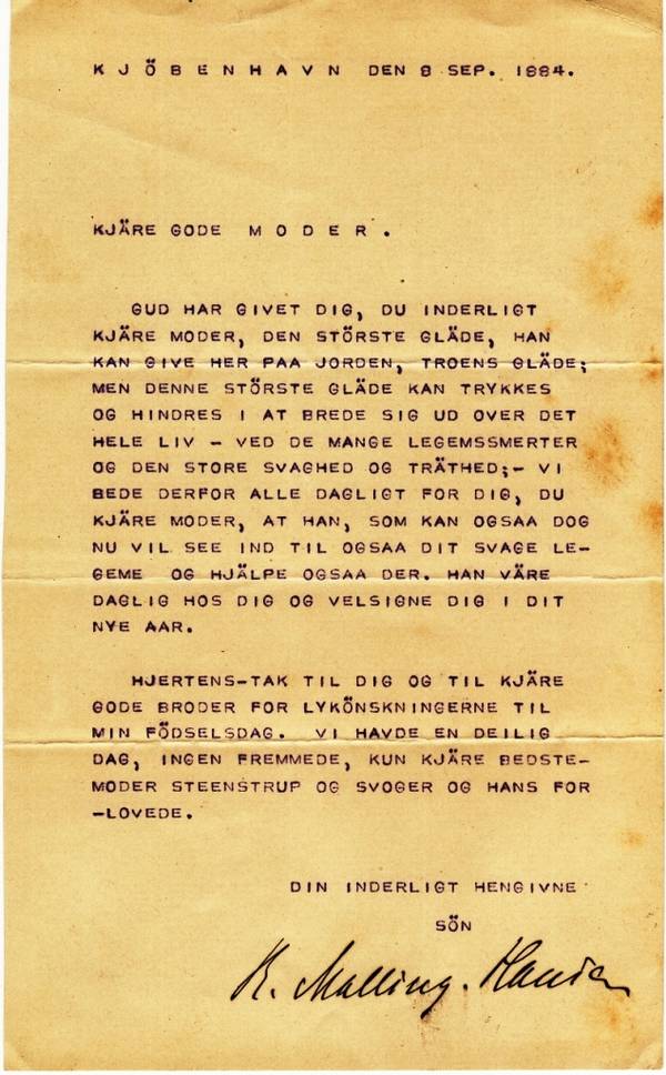 THE GOOD LORD HAS PROVIDED YOU, MY DEAR BELOVED MOTHER, WITH THE GREATEST GIFT HE CAN GIVE ANYONE ON THIS EARTH, AND THAT IS THE JOY OF BELIEVING IN HIM; BUT THIS, THE GREATEST JOY OF ALL CAN AT TIMES BE PRESSED AND HINDERED IN SPREADING OUT ACROSS OUR LIFE - IN PARTICULAR WHEN WE ARE TORMENTED BY MUCH BODILY PAIN, GREAT WEAKNESS AND WEARINESS; - WE ARE THEREFORE PRAYING FOR YOU DAILY, DEAR SWEET MOTHER, THAT HE WHO HAS THE POWER WILL LOOK INTO YOUR WEAK BODY AND HELP YOU ALSO THERE. MAY HE BE WITH YOU DAILY AND BLESS YOU IN YOUR NEW YEAR.