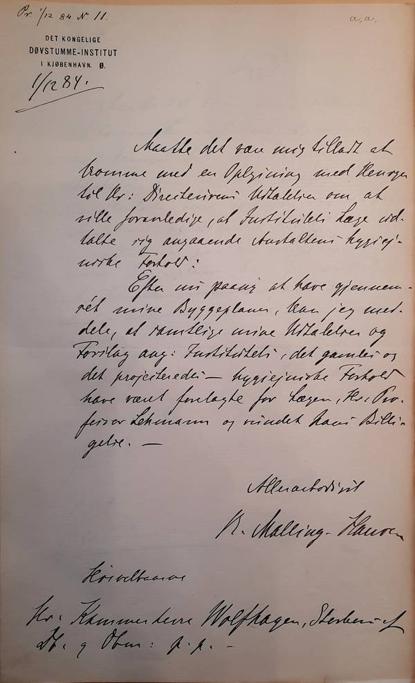 Dette håndskrevne brev findes i Rigsarkivets mappe med dokumenter vedrørende planer om udflytning, tilbygning og forbedringer af det Kgl. Døvstummeinstitut i København.