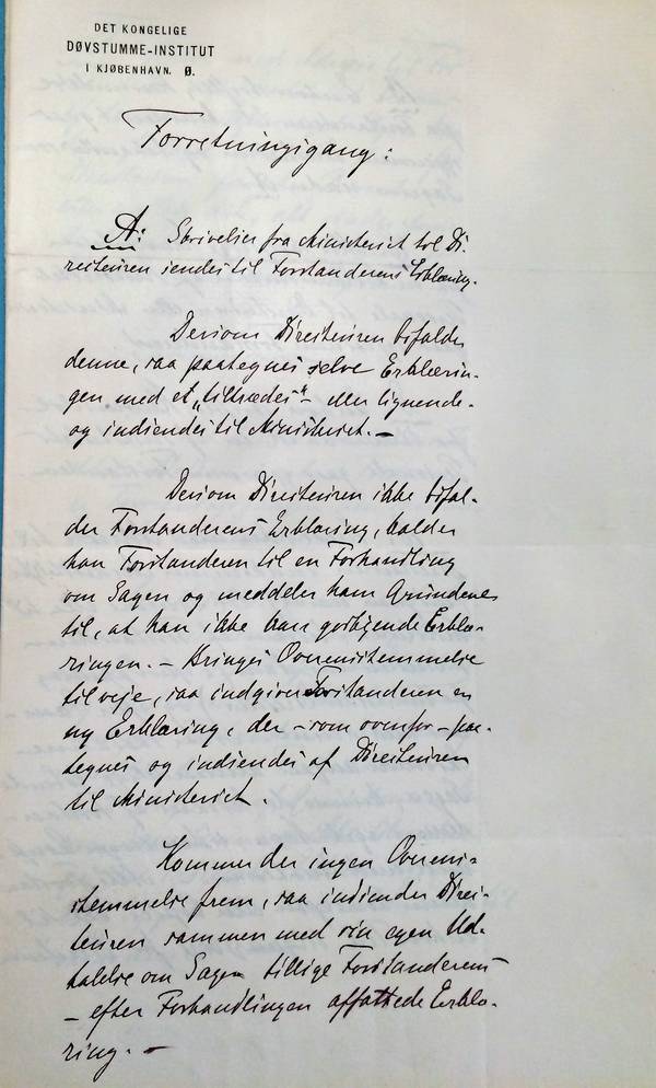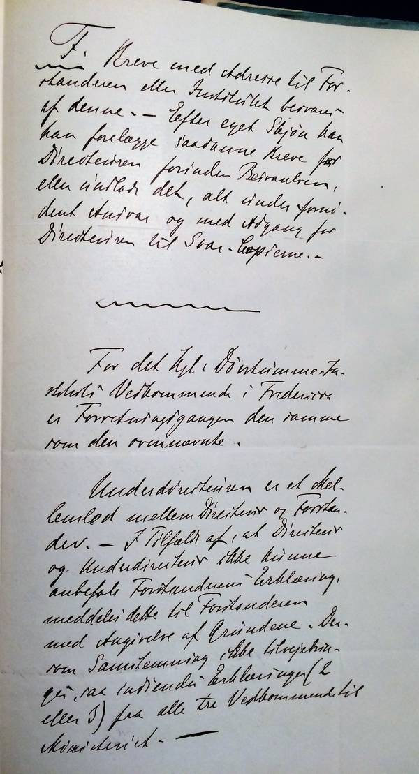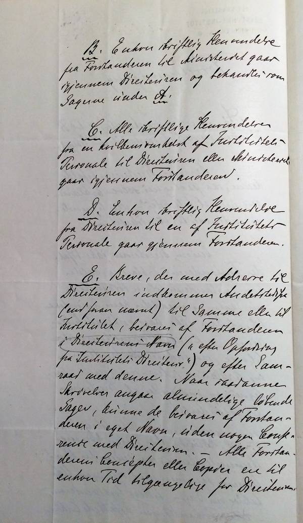 (”efter Opfordring fra Institutets Directeur”) og efter Samraad med denne. Naar saadanne Skrivelser angaar almindelige løbende Sage, kunne de besvares af Forstanderen i eget Navn, uden nogen Conference med Directeuren. – Alle Forstanderens Concepter eller Copier ere til enhver Tid tilgængelige for Directeuren.