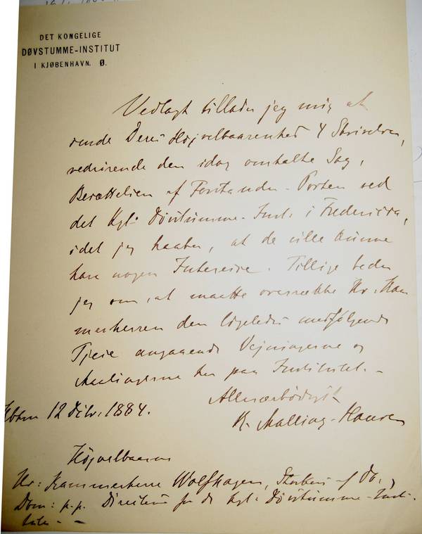 SA: Vi må nok anta at dette bevet har en viss sammenheng med en konfikt som oppsto mellom forstanderen ved Fredericia og den forholdsvis nyansatte direktør Wolfhagen. Jørgensen hadde over lenge tid hatt planer om en større utvidelse for å imøtekomme det økede behovet for areal til nye plasser, og hadde allerede avgjort at ingen nye elever kunne inntas i 1885. Den nyansatte direktøren krevde at det måtte ses etter foreløbige løsninger, men dette satte forstander Jørgensen seg kraftig imot i et brev av 11 December 1884. RMHs brev er altså datert dagen etter, men det fremstår som noe underlig at selve ansettelsesprossessen av Jørgensen skulle ha noen interesse, flere år etter at han ble utnevnt. Jørgensen hadde nok oppfattet at han hadde forståelse i kultusministeriet for sine utvidelesplaner, og de ble da også realisert allerede to år senere. Dette var dog ikke den enest kilden til konflikt mellom Jørgensen og Wolfhagen. Det vakte også Jørgensens vrede at Wolfhagen krevde å få all direktørpost sendt til seg selv, mot tidligerere sedvane, at den ble sendt til underdirektøren, Malling-Hansen, som så avgjorde hva som skulle gå videre til direktøren. Hele denne konflikten er behørig beskrevet i Goos' biografi over døvstummeundervisningen i Danmark fra 1807, og der sies at Jørgensen aldri kom over sin mistro til Wolfhagen etter disse konfliktene. Senere ble også Malling-Hansen rasende på Wolfhagen fordi han krevde å få full kontroll over posten til direktøren også ved "RMH"s døvstummeinstitutt. Men foreløbig ser det ut til at RMH forsøker å etablere et godt forhold tl sin nye sjef, og enn så lenge er tonen vennlig.